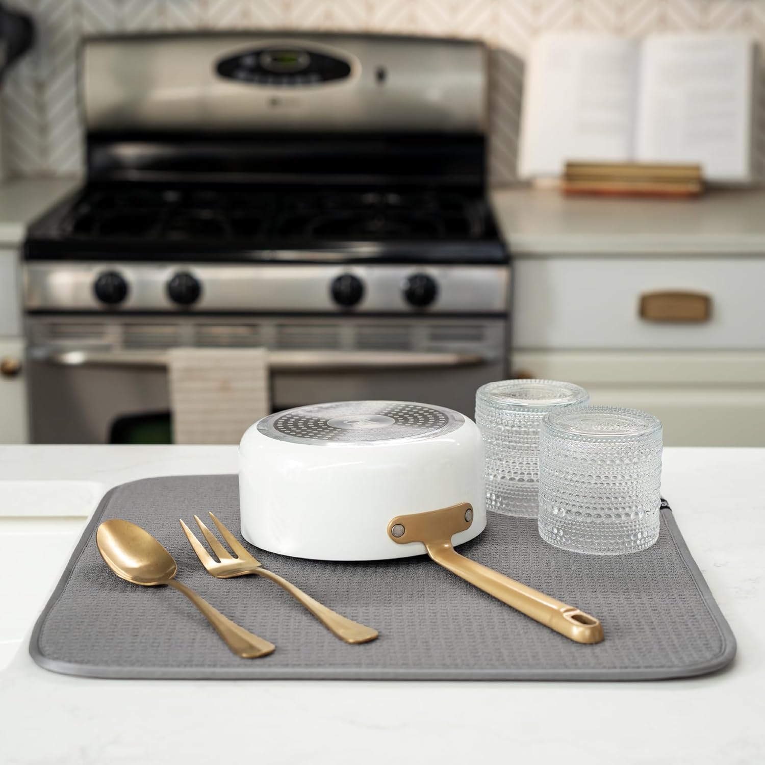 - Dish drying mats for kitchen counter are reusable, machine washable, and easy to store for kitchen organization; durable construction will not chip or break like a stone dish drying mat for kitchen