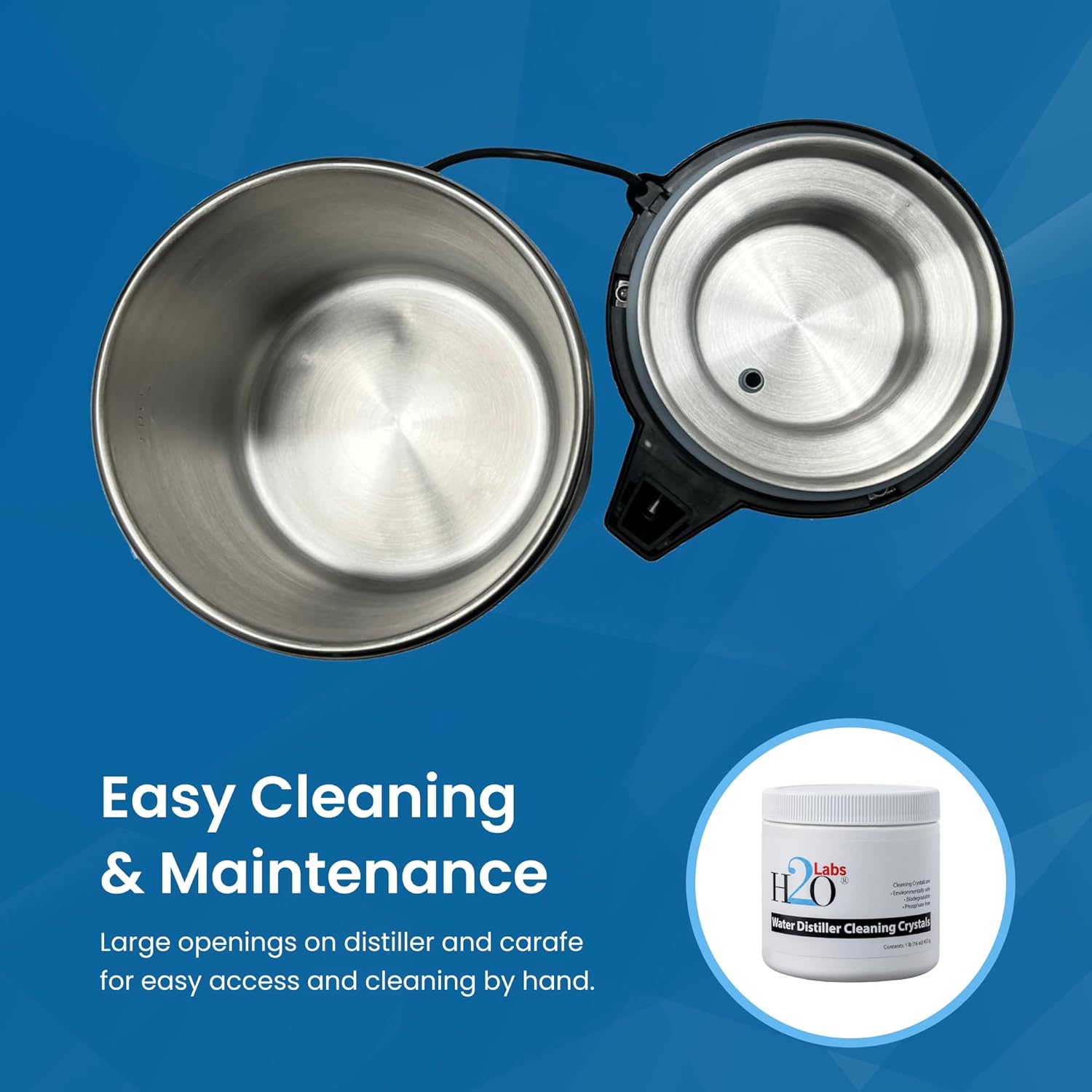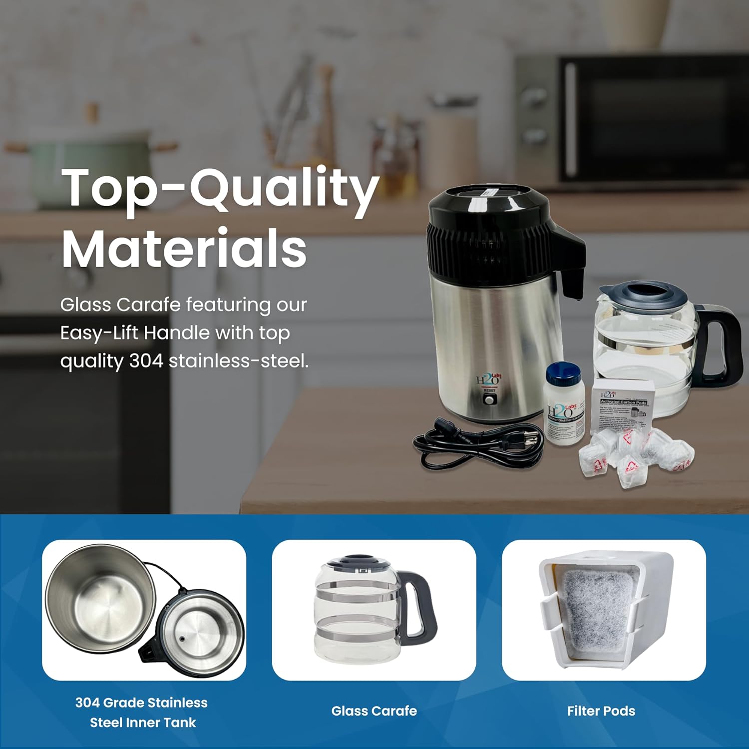 - Everything you need to begin making the PUREST water ever is included! Along with your water distiller you’ll receive the "Easy Grip" glass carafe, a large jar of non-toxic Cleaning Crystals in case it's needed for hard water scale, and a year's supply of H2o Labs Exclusive Activated Carbon Pods. You also receive the most complete, useful and easy-to-understand instruction manual in the industry.