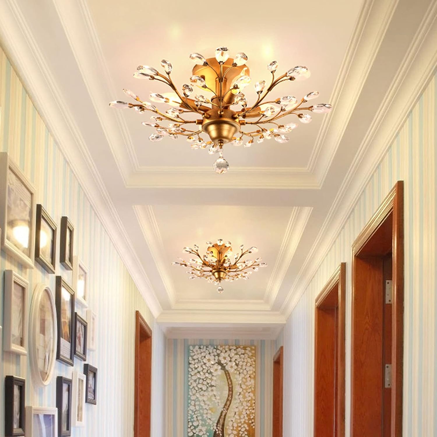 - WIDELY USE: Crystal ceiling light has 2 colors for optional,Gold show elegant, black add retro feeling, ideal for Aisle, Hallway, Bedroom, Living Room, Dining Room, Kitchen, Bar, Hotel, Balcony, Stairwells children’s room pass way, kids room, or small space etc. It will be eye catching for your well-appointed space no matter where you use it.