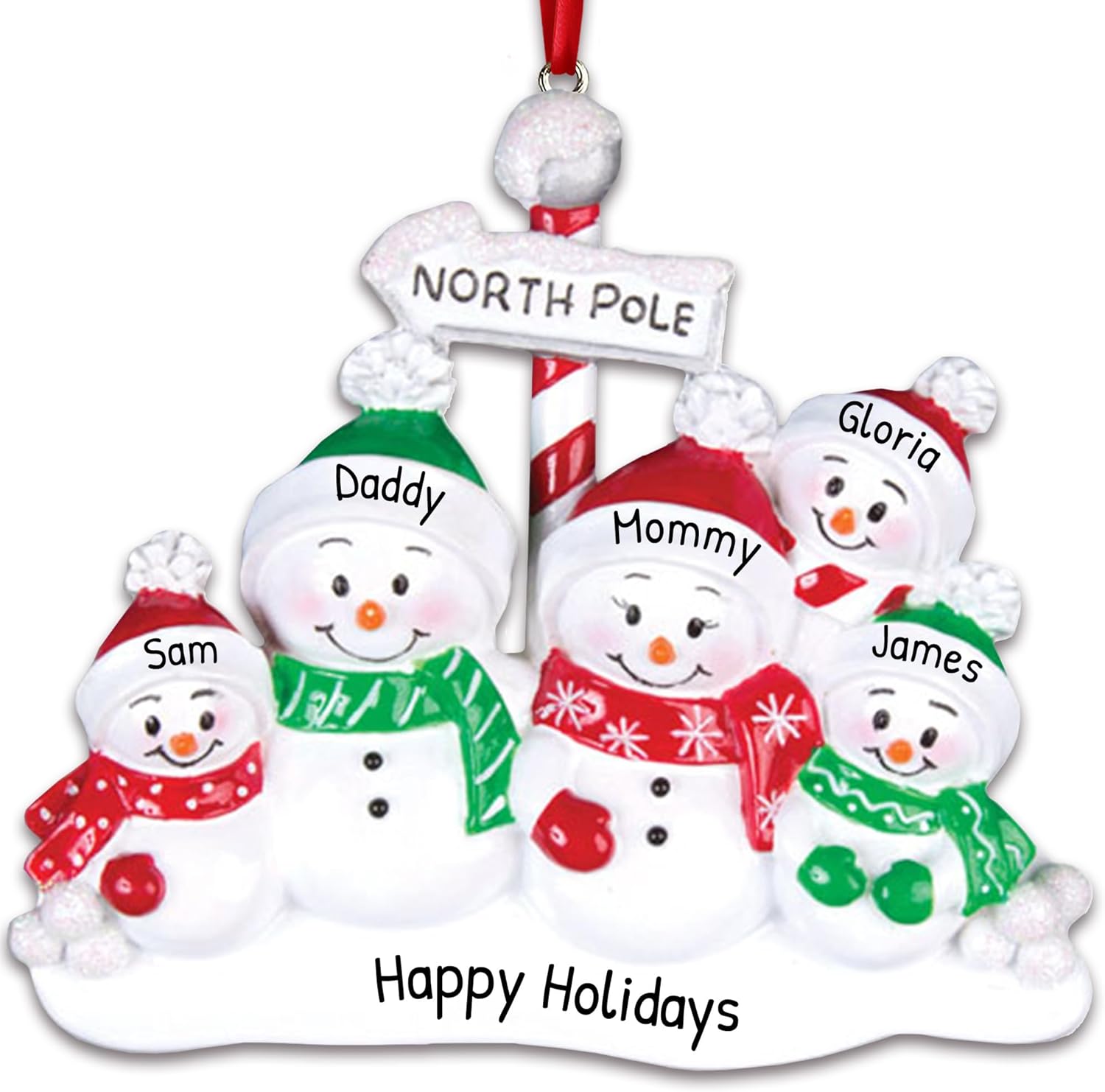 - ๐ Celebrate Your Family of 5: Mark a joyful milestone with a personalized family of 5 Christmas ornament 2025. Whether itโs your first year as five or part of a cherished tradition, this keepsake honors your growing bond and tells your story with warmth, love, and festive cheer. This snowman family of five ornament features smiling snow faces and carrot noses, red and green winter accessories, and a North Pole sign with glitter top, bringing a cozy snow scene holiday theme to life.