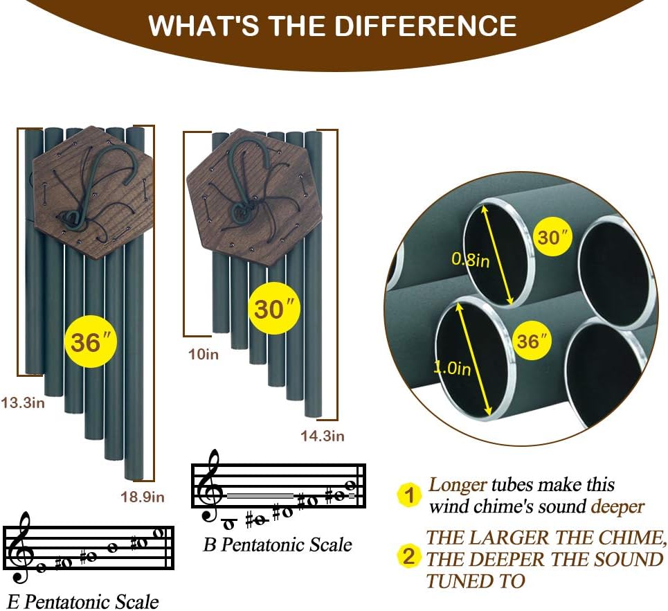 - ♪ Large Wind Chimes Outdoor - Total hanging overall length is 36”with a stronger metal hook. Large wind chimes produce lower, fuller ,deep tone.6 aluminum powder-coated tubes are hand-tuned by our professional tuning experts to achieve a superior musical performance.Heavy duty nylon cording high density beech wood striker for a clear tone and resonances.Thick tubing wall creates a longer lasting deep tone.The sound is soft,deep tone and relaxing .