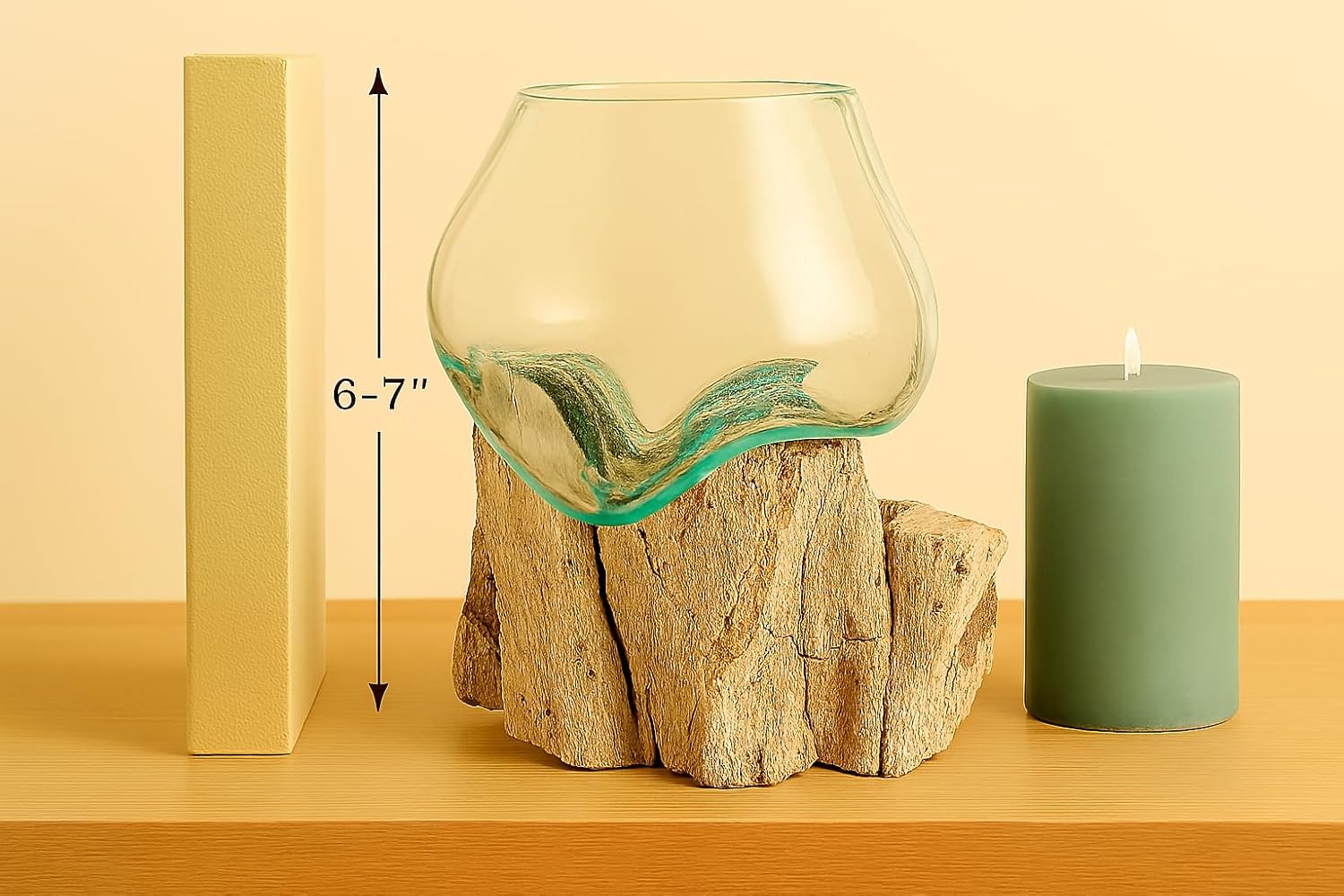 OMA Molten Glass on Driftwood – Hand Blown Vase, Terrarium, or Planter for Coastal & Boho Home Décor Centerpieces (6" - 7" High)