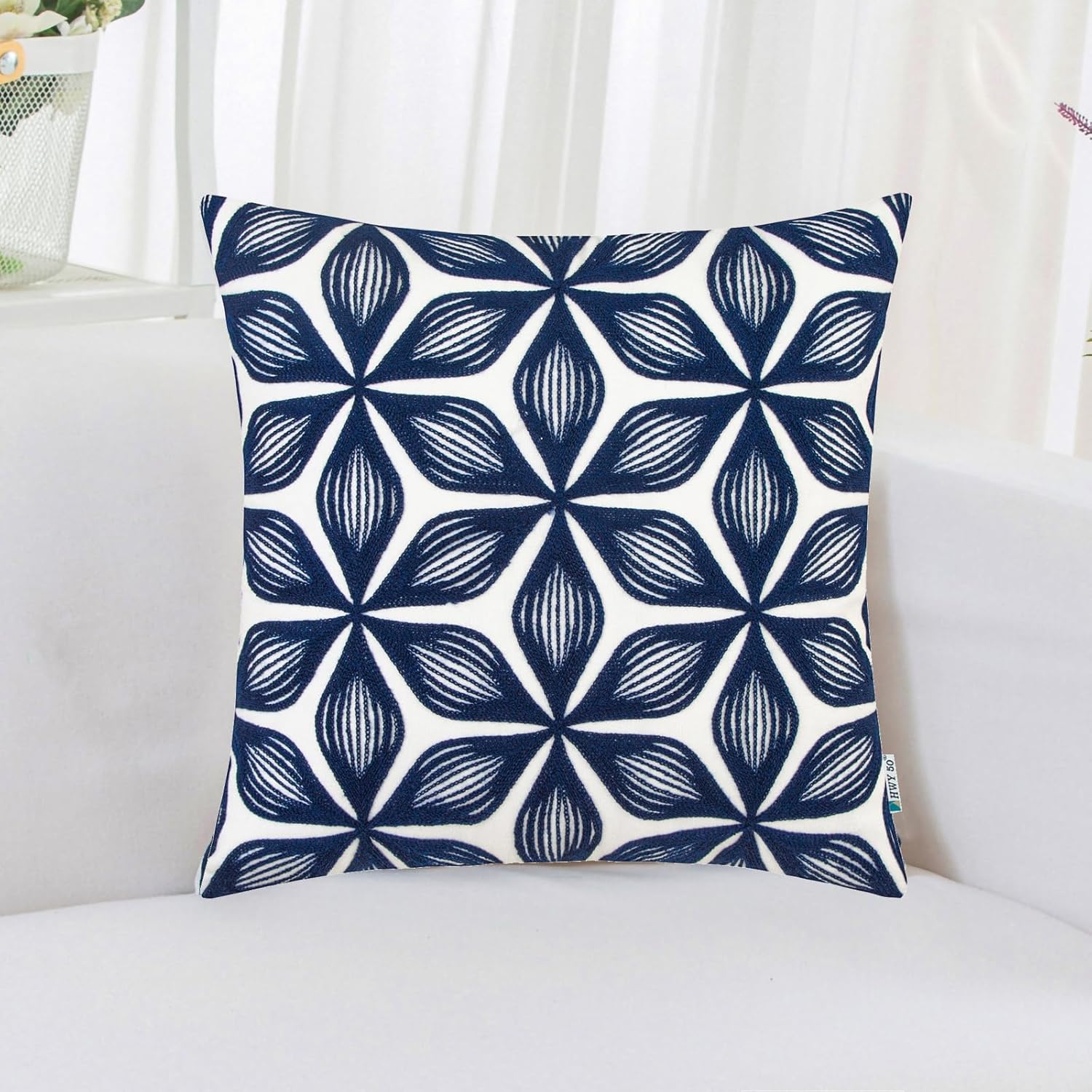 HWY 50 Navy Blue Decorative Throw Pillow Covers 18x18 Inch (1 Piece), Embroidered Cotton Farmhouse Cushion Cover Pillow Case for Sofa Couch Living Room Bed, Fashion Geometric