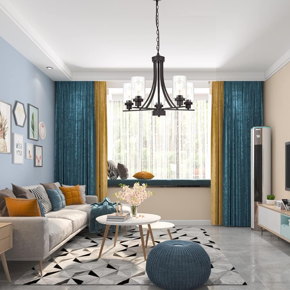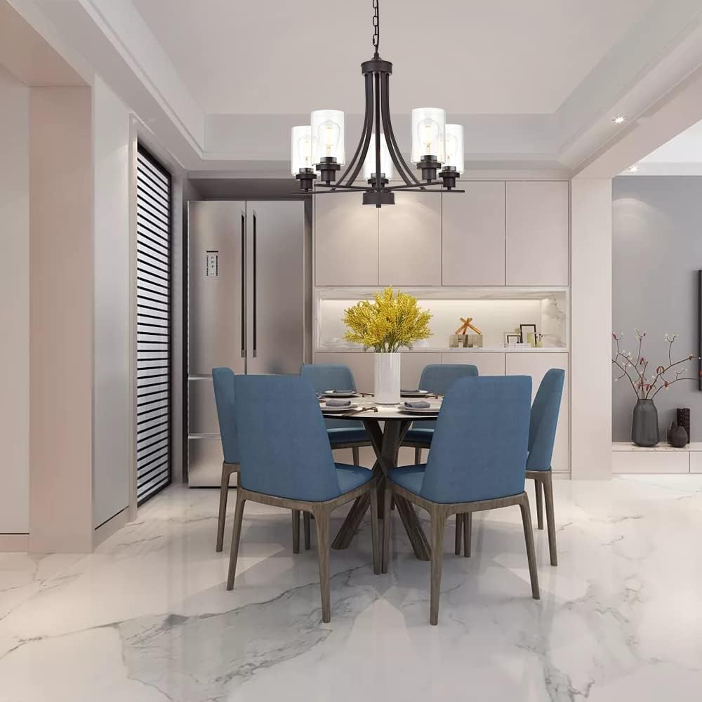 - ๐ 5 Light Glass Chandelier: This contemporary chandelier with high clear glass shades๏ผit is an elegant update for traditional and modern homes alike.It's the perfect light fixture to install in kitchen, island, dining room,living room,foyers ,hallway,bedroom,coffee bar, lobby, restaurant and any space you like.