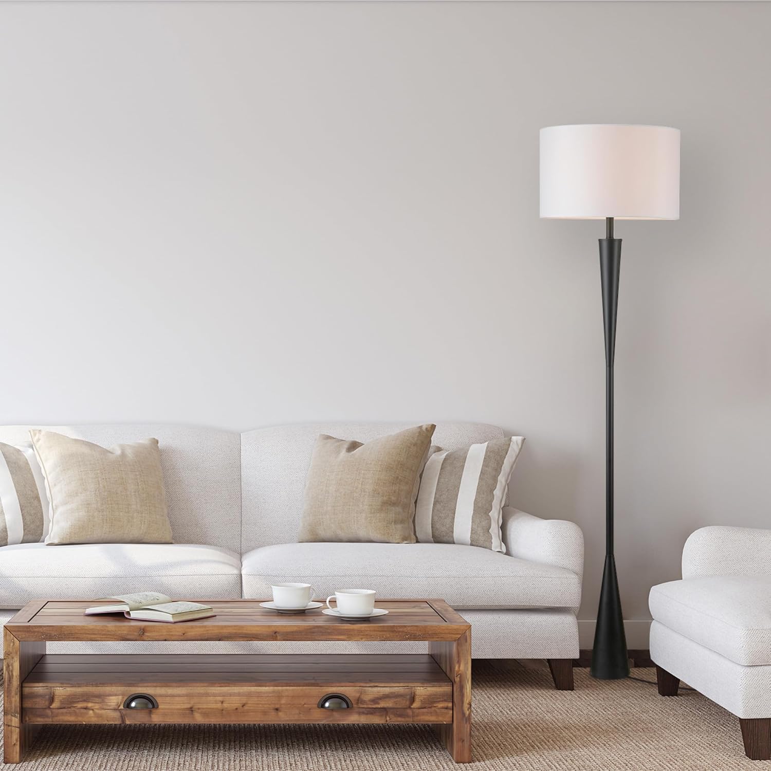 Globe Electric 67224 70" Floor Lamp, Matte Black Finish, White Fabric Shade, Modern Tapered Frame, E26 Base, Contemporary Living Room and Bedroom Lighting