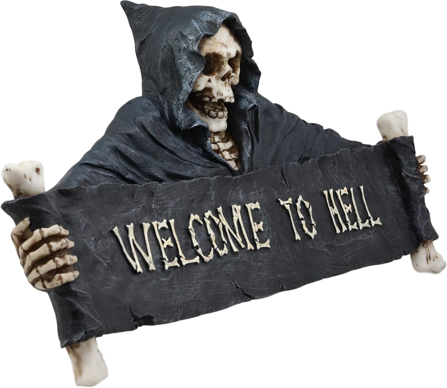 - This Grim Reaper With "Welcome To Hell" Scroll Wall Hanging Decor is made of designer composite resin, hand painted and polished individually. Color Tone may vary. Screw anchor is recommended before installing this wall decor (hardware not included).