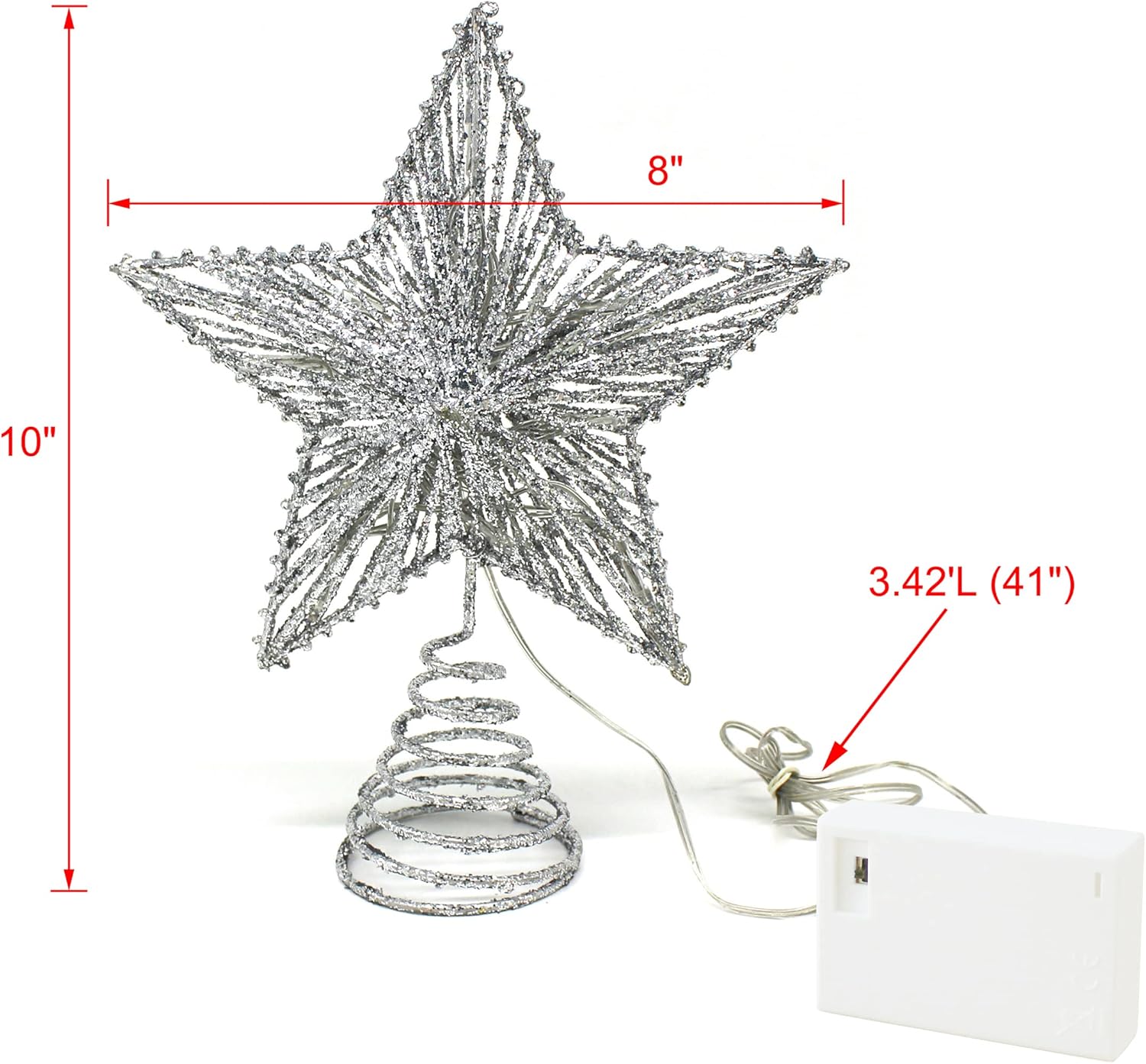 CVHOMEDECO. Silver Glittered 3D Tree Top Star with Warm White LED Lights and Timer for Christmas Tree Decoration and Holiday Seasonal Décor, 8 x 10 Inch