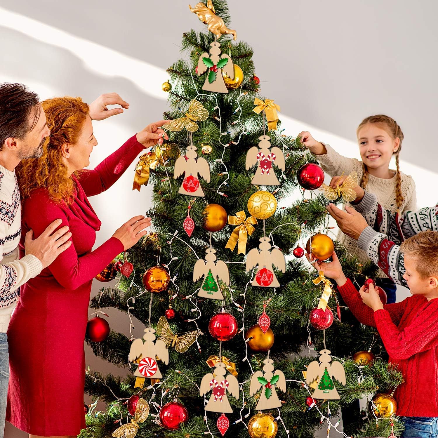 Blulu 60 Pieces Christmas Wooden Ornaments Round Wood Slices Snowflake Angel Shape with Cords for DIY Crafts New Year Christmas Tree Pendant Ornaments