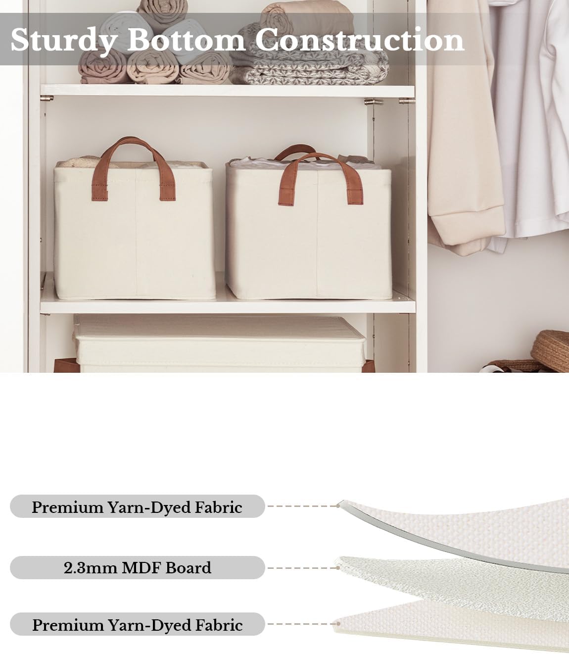 - Premium Quality: Made from high-quality fabric and reinforced with a heavy-duty MDF bottom board and a sturdy metal frame. The solid construction enables the storage bins to stand upright without support, even when empty.