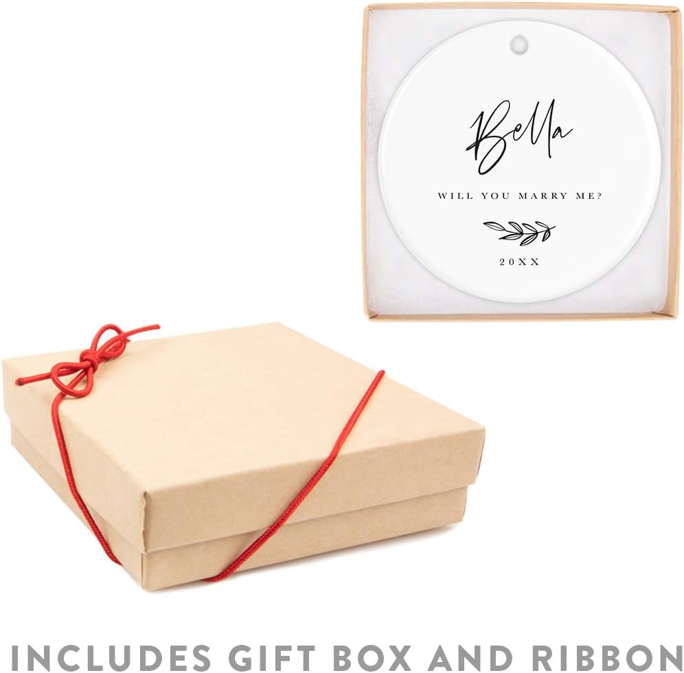 - PERSONALIZED ENGAGEMENT ORNAMENT: Celebrate your proposal with this stunning personalized will you marry me ornament 2024. The round 2.8-inch wide porcelain christmas ornaments features the heartfelt message, "(Name) Will You Marry Me?", making it an ideal will you marry me christmas ornament. Includes 1 gold cord ribbon and 1 gift box, perfect for gifting as a memorable will you marry me gift. Add this unique piece to your collection of collectible christmas tree ornaments.