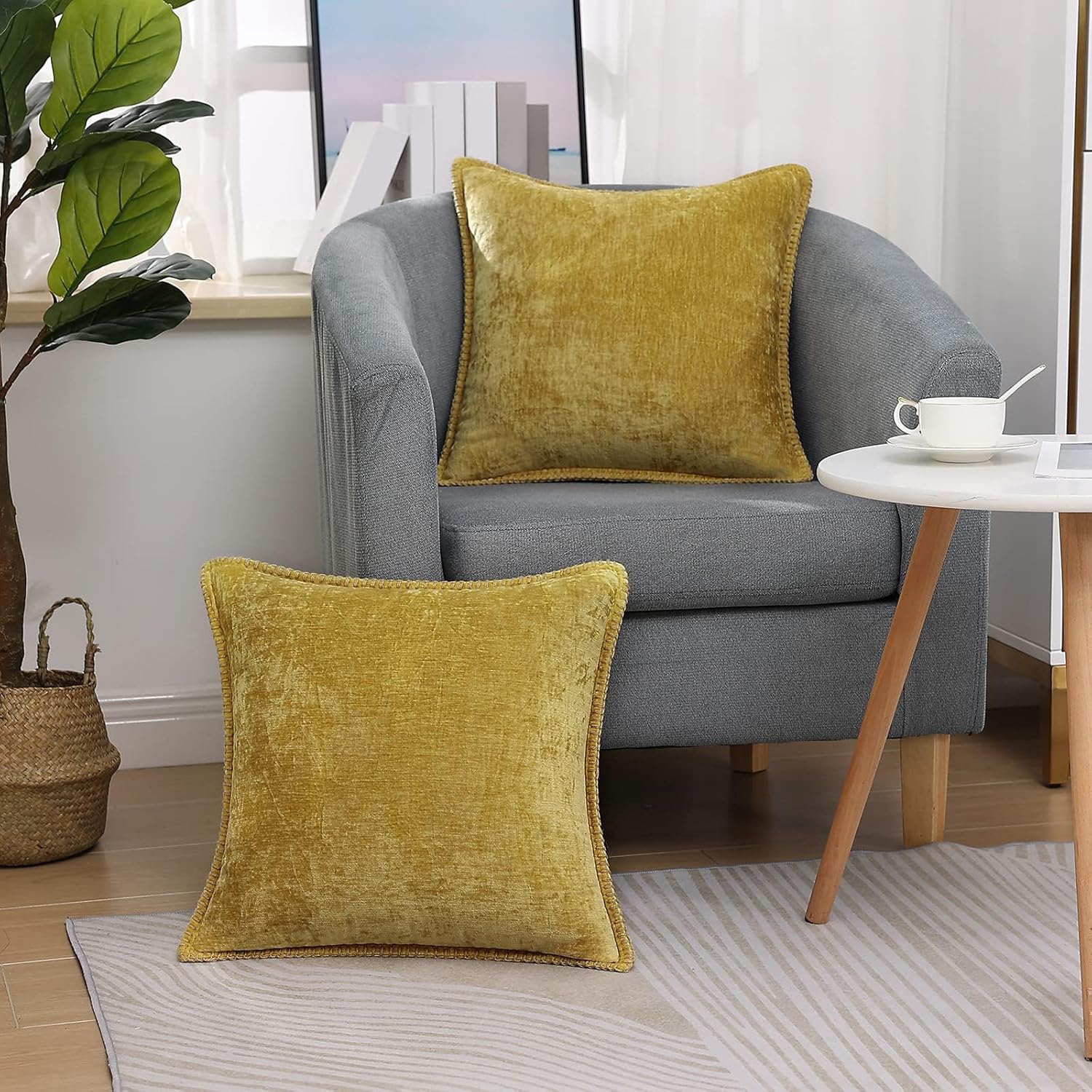 decorUhome Chenille Soft Throw Pillow Covers 18x18 Set of 2, Farmhouse Velvet Neutral Decorative Euro Pillow Covers with Stitched Edge for Couch Sofa Bed Home Decor, Mineral Yellow