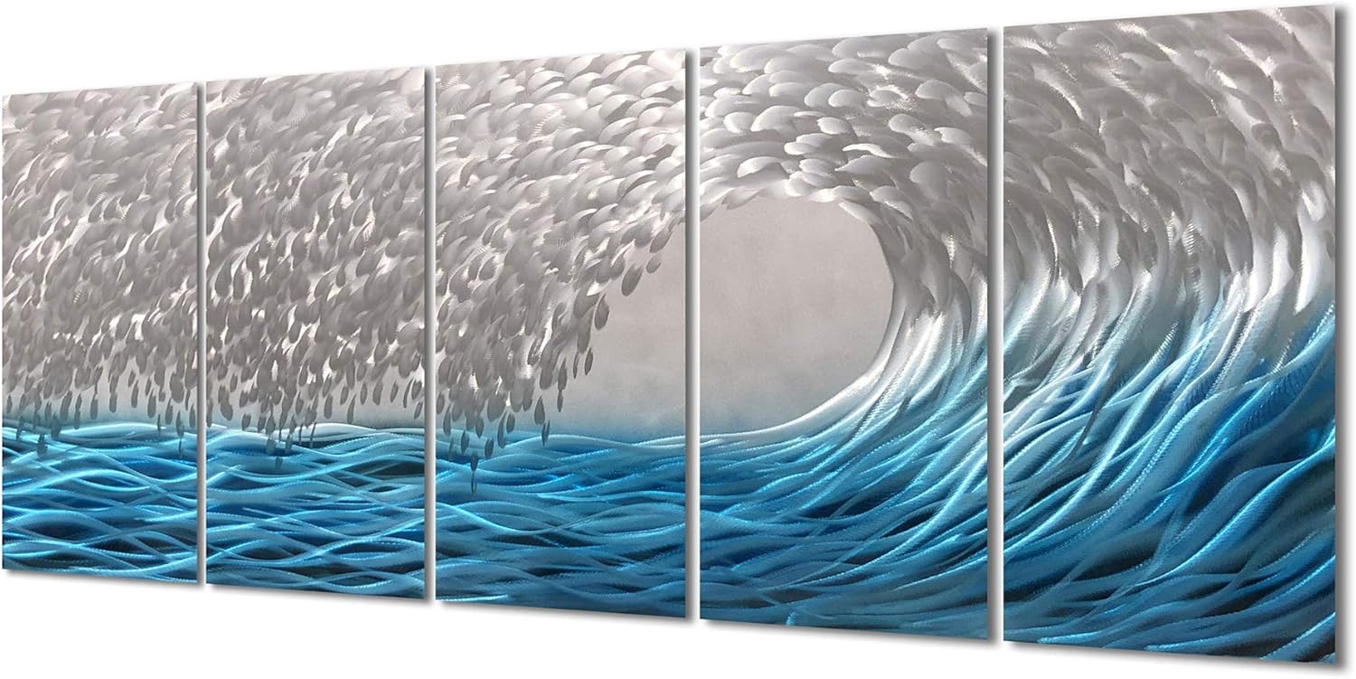 Yihui Arts Metal Wall Art - Silver Sea Waves 3D Sculpture, 5 Piece Hand Crafted Aluminum Coastal Artwork for Large Abstract Living Room, Bedroom, Bathroom Decor - Blue