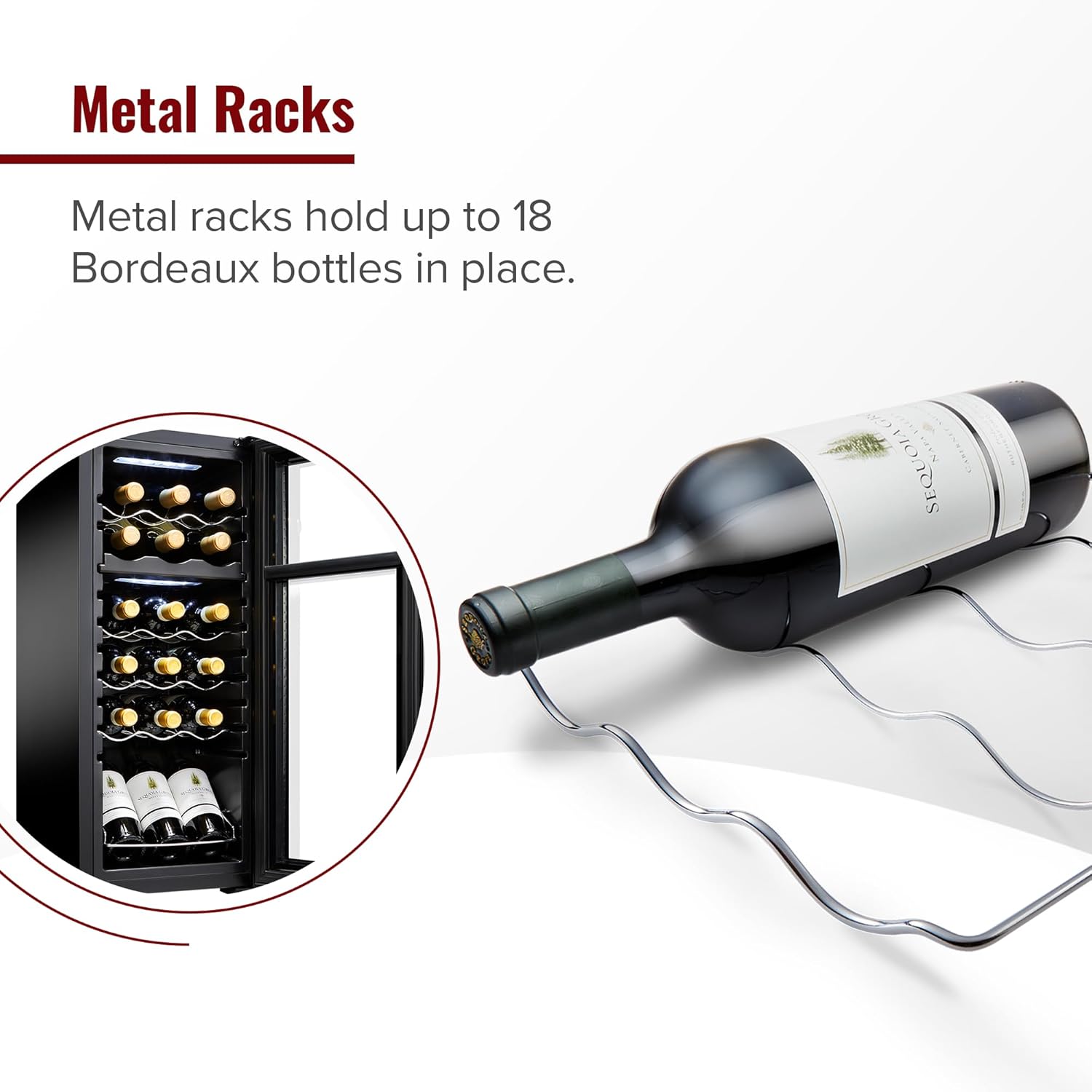 - 18-Bottle Wine Fridge Capacity: Store up to 18 standard wine bottles in a sleek, compact design. Whether you're a wine enthusiast or just starting your collection, this mini fridge offers ample space to preserve and display your wines