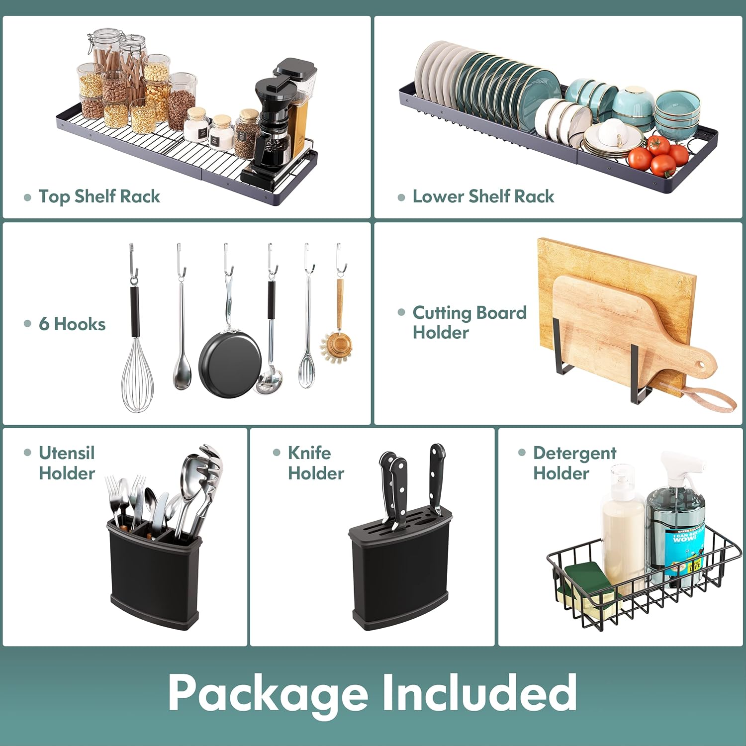 - 🔄 Expandable Design for Custom Fit: Adjust the over sink dish drying rack width effortlessly to span most standard single or double sinks, adapting seamlessly to your kitchen layout. The dish drain modular design allows rearranging tiers and accessories to prioritize space for tall glasses, wide pans, or cleaning tools, maximizing vertical storage above the sink