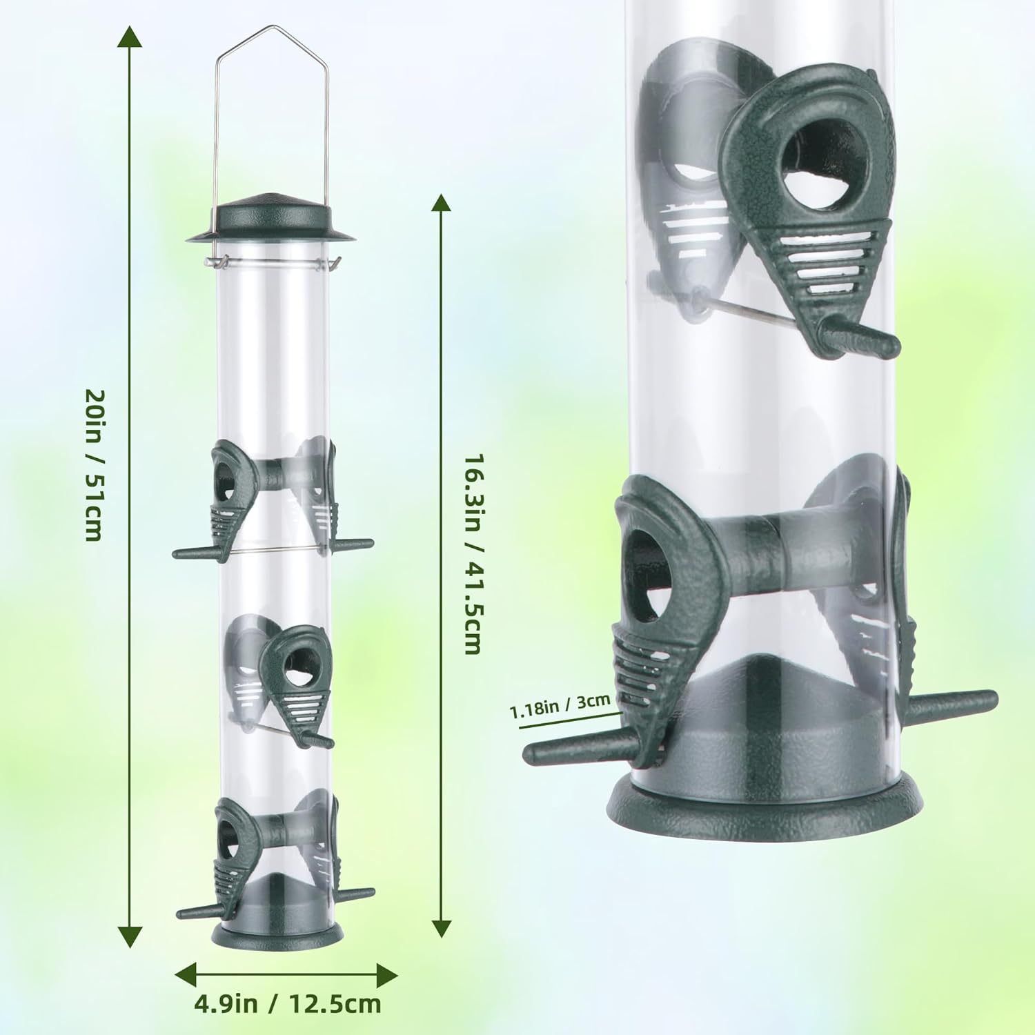 - Dimension of bird feeders for outdoors hanging: The size of tube bird feeders for outdoors hanging is 5 x 5 x 20 inch.You can use outdoor bird feeder easily without installing any tools, and you can also move it freely