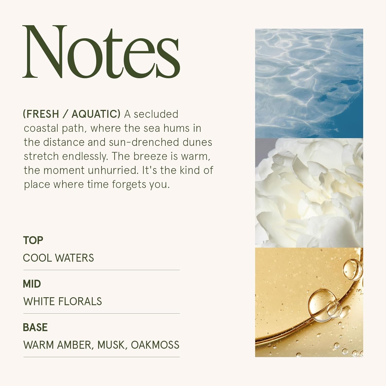 - AEGEAN SEA & DUNE - Cool Waters and juicy pear with elegant white florals, combined with the warmth of amber, musk, and oakmoss which anchors this fragrance