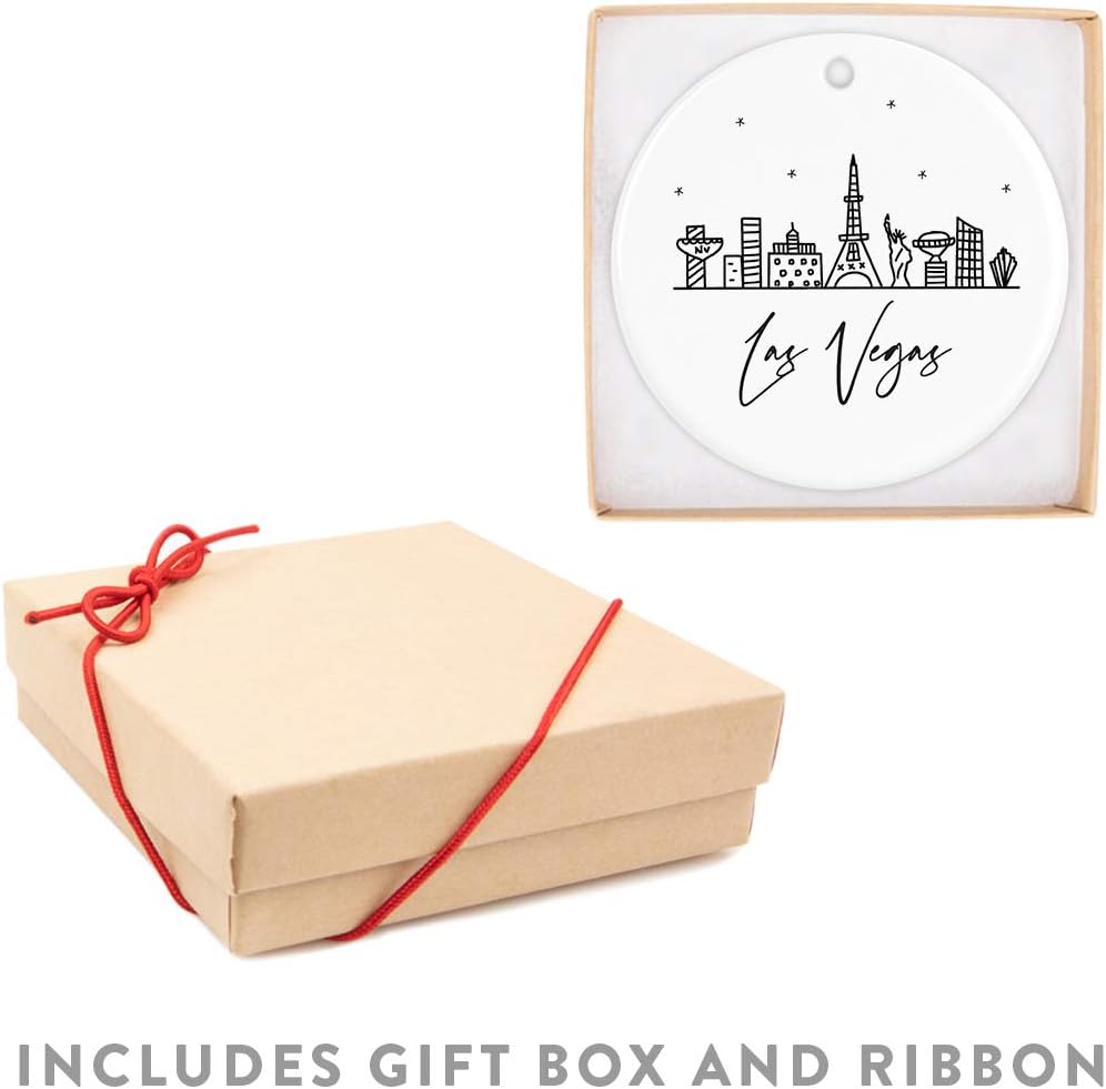 Andaz Press Round Ceramic Porcelain Christmas Tree Ornament Keepsake, Las Vegas Black and White Stars City Skyline Graphic, 1-Pack, Birthday Gift Idea for Family, Coworker, Him, Her, Includes Gift Box