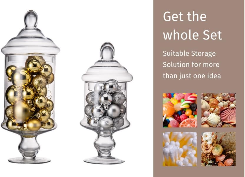 - GORGEOUS DECORATION JARS: This classic footed apothecary jar with lid is versatile and can be used with decor items. It looks great with sand, shells, pine cones, maples leaves or flowers to add energy flows into your environment.