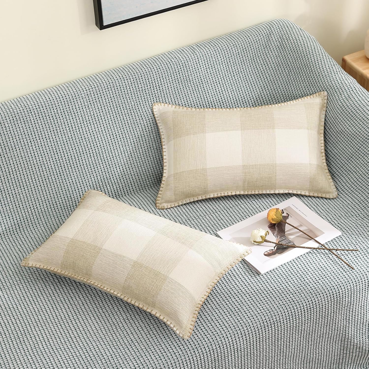 decorUhome Buffalo Plaid Check Fall Throw Pillow Covers 12x20 Set of 2, Outdoor Lumbar Decorative Farmhouse Pillow Covers with Stitched Edge for Bed Couch Sofa, Cream White and Beige