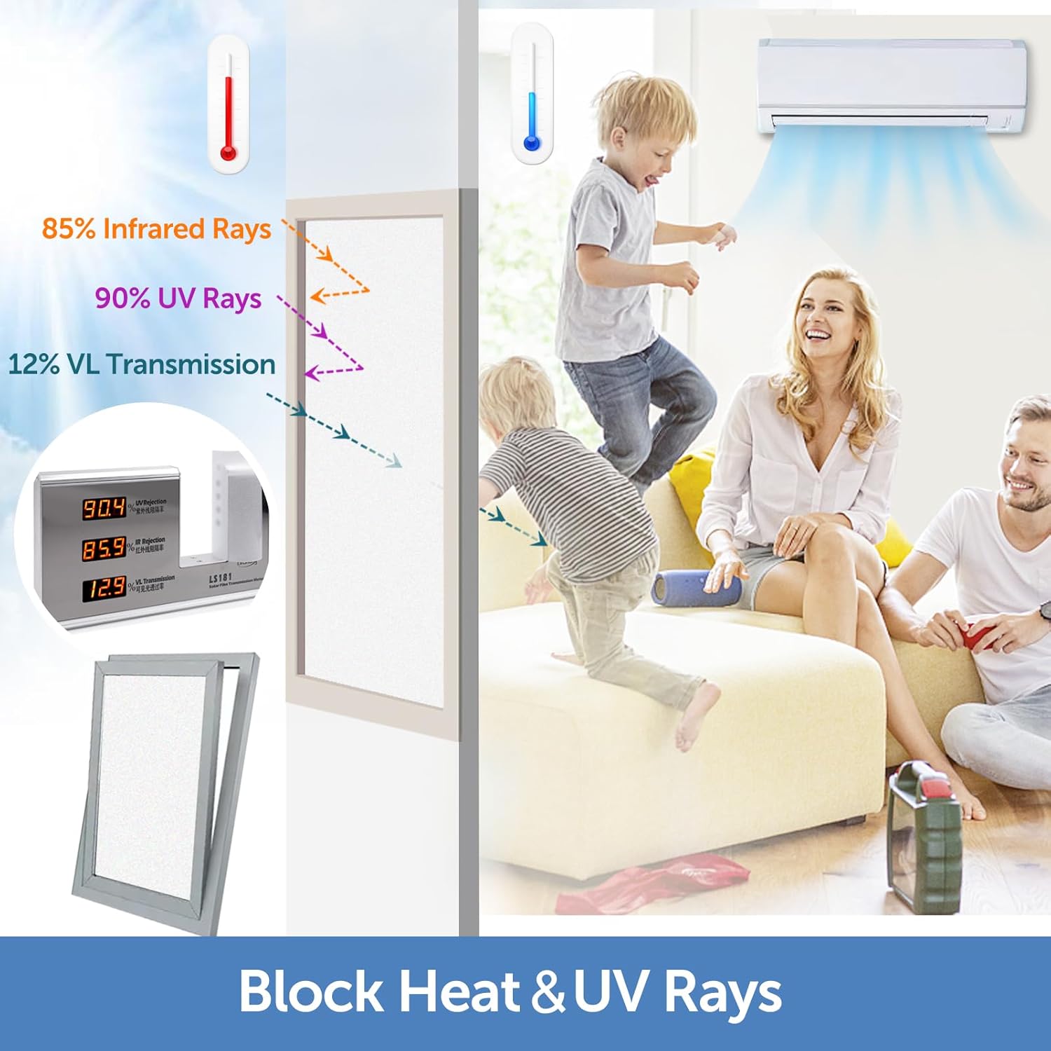 - SUN UV BLOCKING & HEAT CONTROL: Sun blocking window film can block 93% harmful UV rays and 86% infrared rays(Solar heat), and can also prevent your family's skin from aging and furniture from fading. Frosted window film insulates heat in the summer and keeps it warm in the winter, helping to reduce air conditioning costs and save money.