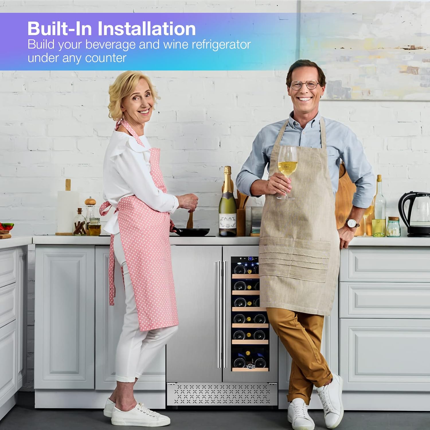 - Built-In or Freestanding Installation:The 24” wide wine and beverage fridge can be installed both under a counter built-in or freestanding;Requires only (H x W x D)34.25 x 23.42 x 22.63 inches of space and can be installed;The built-in installation enables a maximum door opening angle of 180 degrees, and a freestanding style to a maximum of 225 degrees;User-friendly design for you to manage your wine collections or drinks;