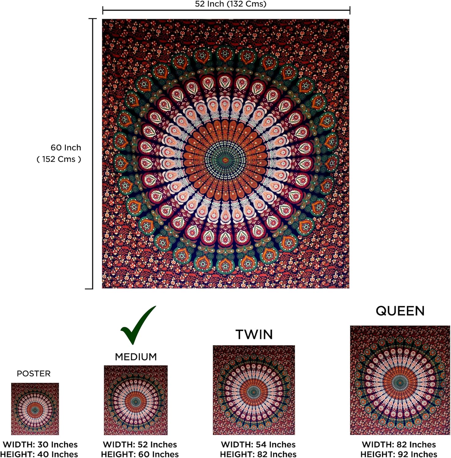 - MATERIAL & SIZE : Mandala boho Tapestry is made of 100% cotton fabric, made and printed in India, With hand sewing, easy to hang, the edges are neat and finished and used for both indoor and outdoor purpose, size Medium (52x60 Inches / 132x152 Cms)