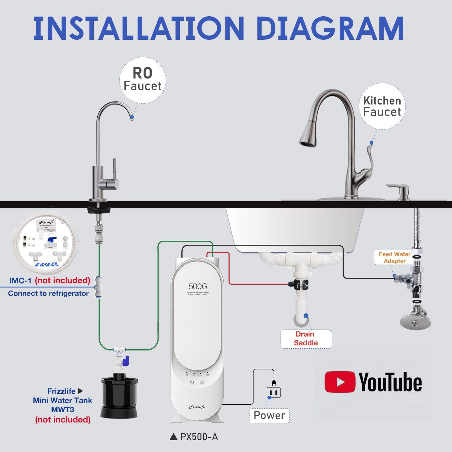 - 【Tankless design】With a high capacity of 500 Gallons per day, Frizzlife PX500-A RO water filter system abandons the traditional water tank. It takes up less space under the counter and swipes out the secondary pollution caused by the unventilated tank. The direct water flow reaches up to 0.4 GPM@ 60psi. The system could also be hooked up to your refrigerator by using IMC-1 ice maker connection kit, providing you with crystal and healthy ice cubes.