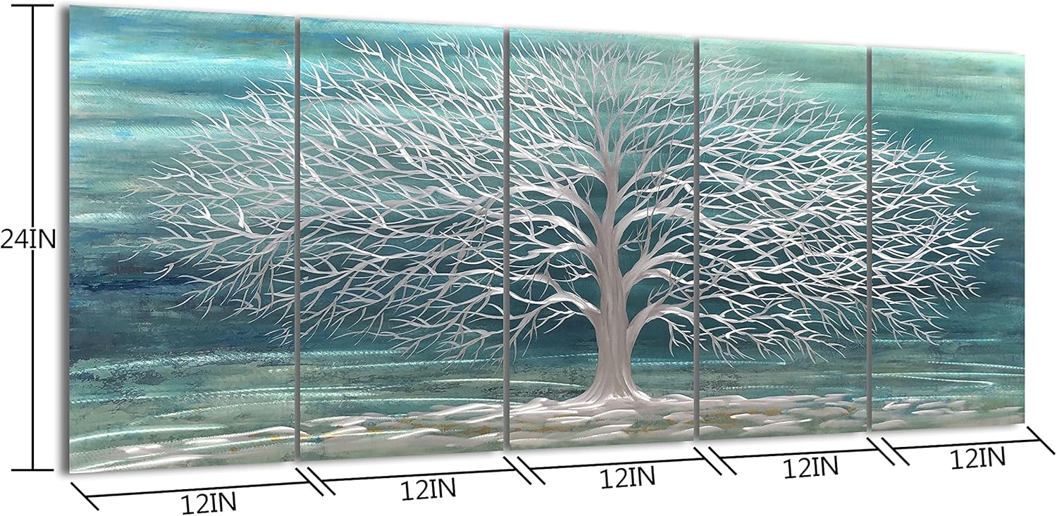 Yihui Arts Large Metal Wall Art Handcrafted Aesthetic Tree Pictures on Aluminum 5 Panels Teal and Silver Abstract Landscpae Artwork for Living Room Bedroom Dinning Decor