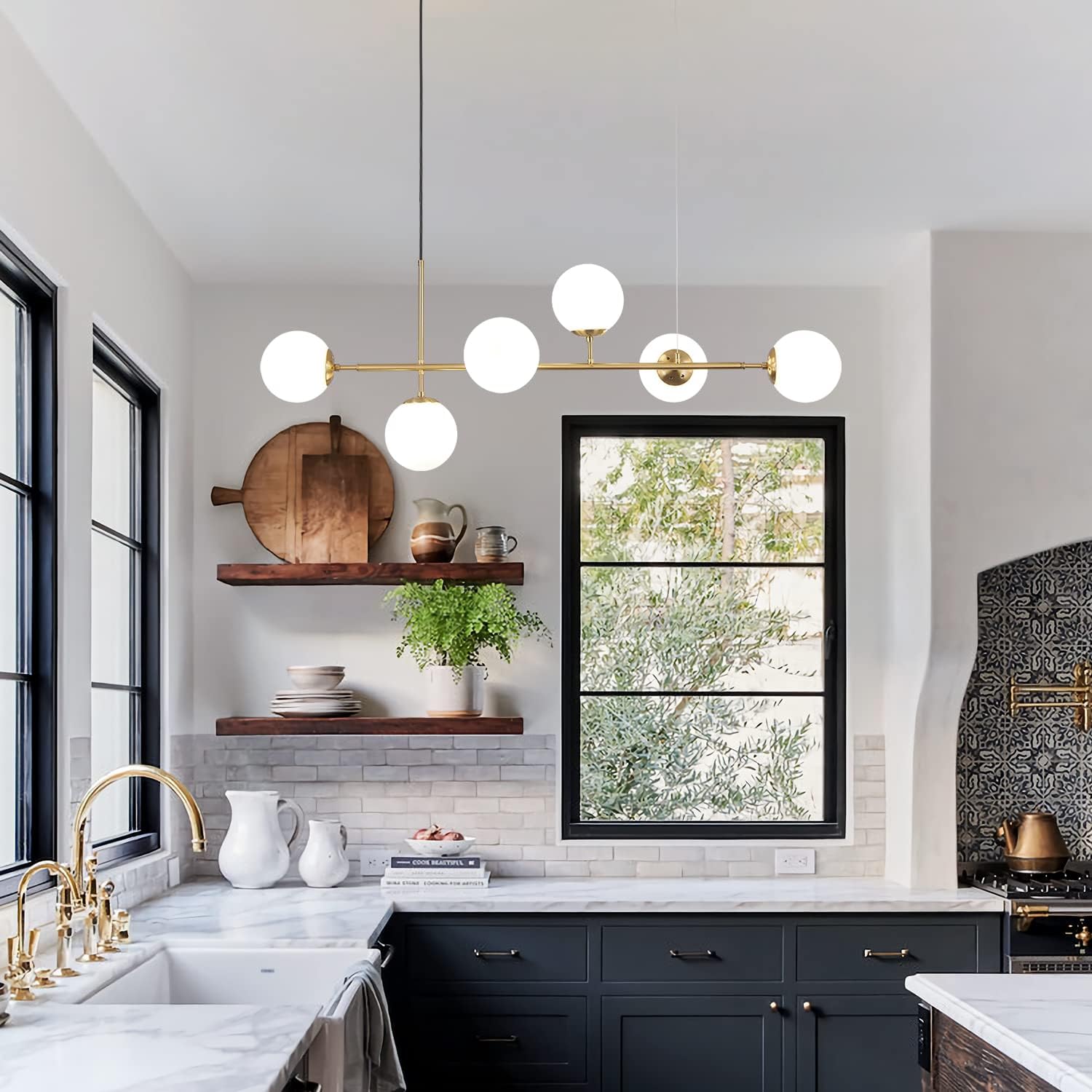- Modern Chandeliers with Milk Glass Shade: The modern chandelier island light is supported by simple golden iron lamp body, 6 glass balls like white milk are suspended around the gold rod, which brings a modern sense to its vintage style and presenting an elegant and atmospheric texture to your room