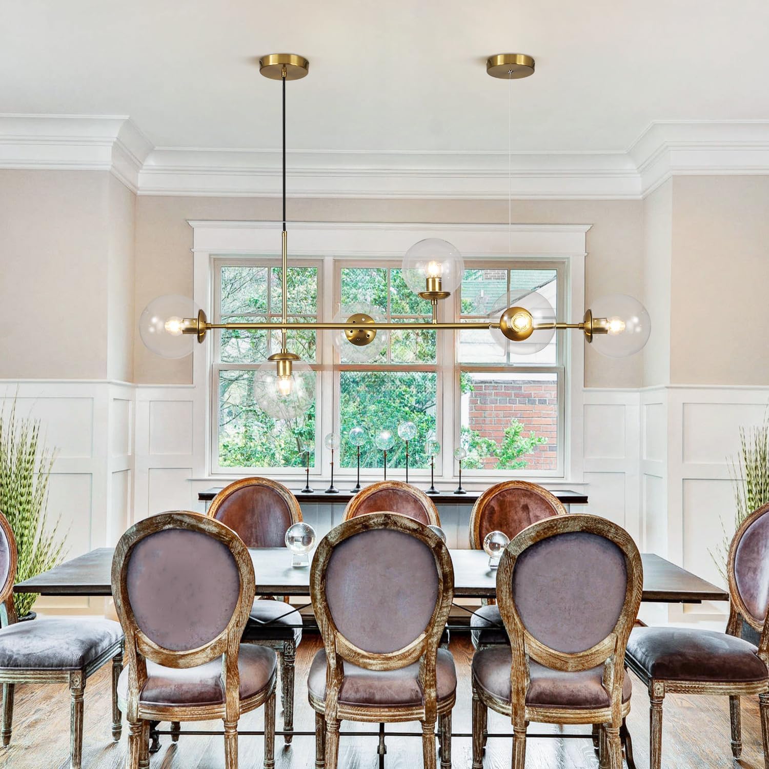 KCO Lighting 6 Light Bubble Chandelier Lighting Clear Glass Globe Chandelier Brass Gold Linear Pendant Light Mid Century Modern Pendant Light for Living Room Kitchen Island Dining Room
