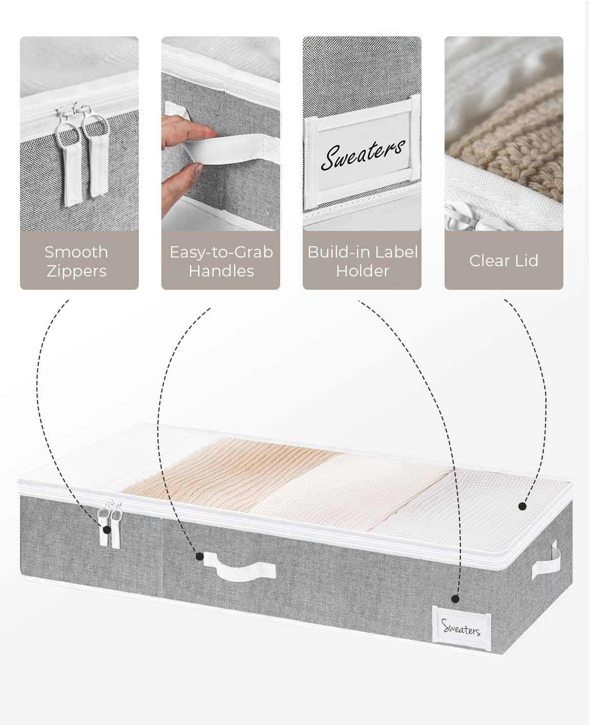 - Underbed storage box featuring thick sewn-in handles on 3 sides for easy carry and retrieval.