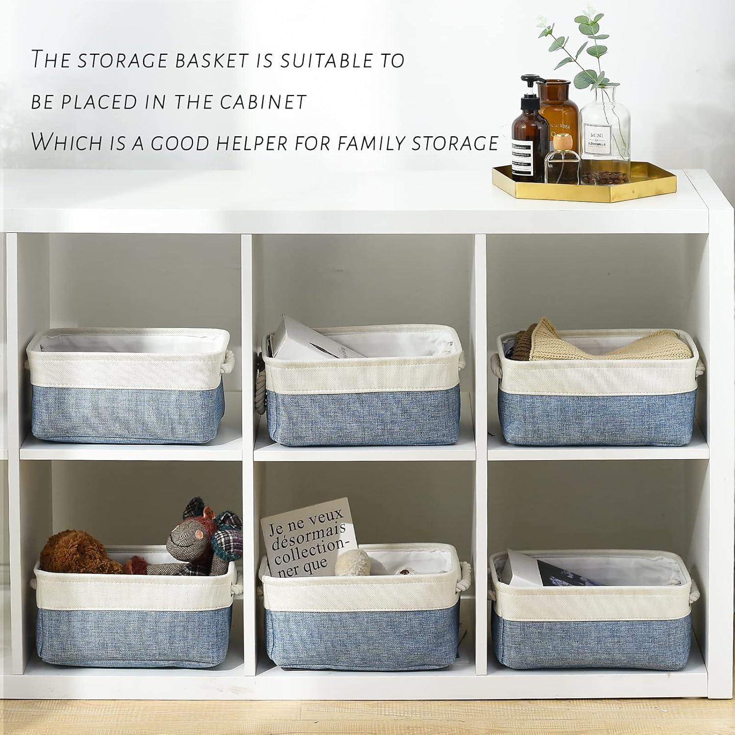 TcaFmac Storage Basket for Shelves - Small 6 Pack Fabric Storage Bins for Organizing, Collapsible Storage Cubes with Handle for Closet Cloth Toy Decorative Gift (White & Blue11.8 x 7.8 x 5.2 inch)