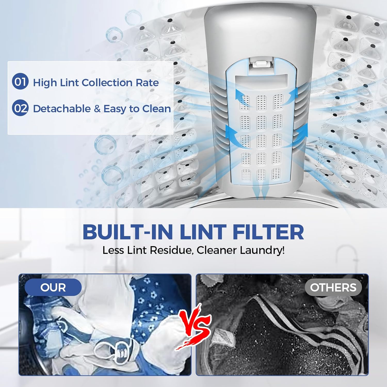 - 【Compact Design & Large Load Capacity】--- Comes with spacious capacity, powerful motor and drain pump, this washer machine is compact and lightweight for you to easily move it in your home. No installation and easy operation.The transparent lid allows you to view and monitor the water and washing conditions.The honeycomb shaped inner tub can load 17.8lbs at one time and wash many clothes for you. Suitable for dorms, apartment, condos, RV's, camping and more.