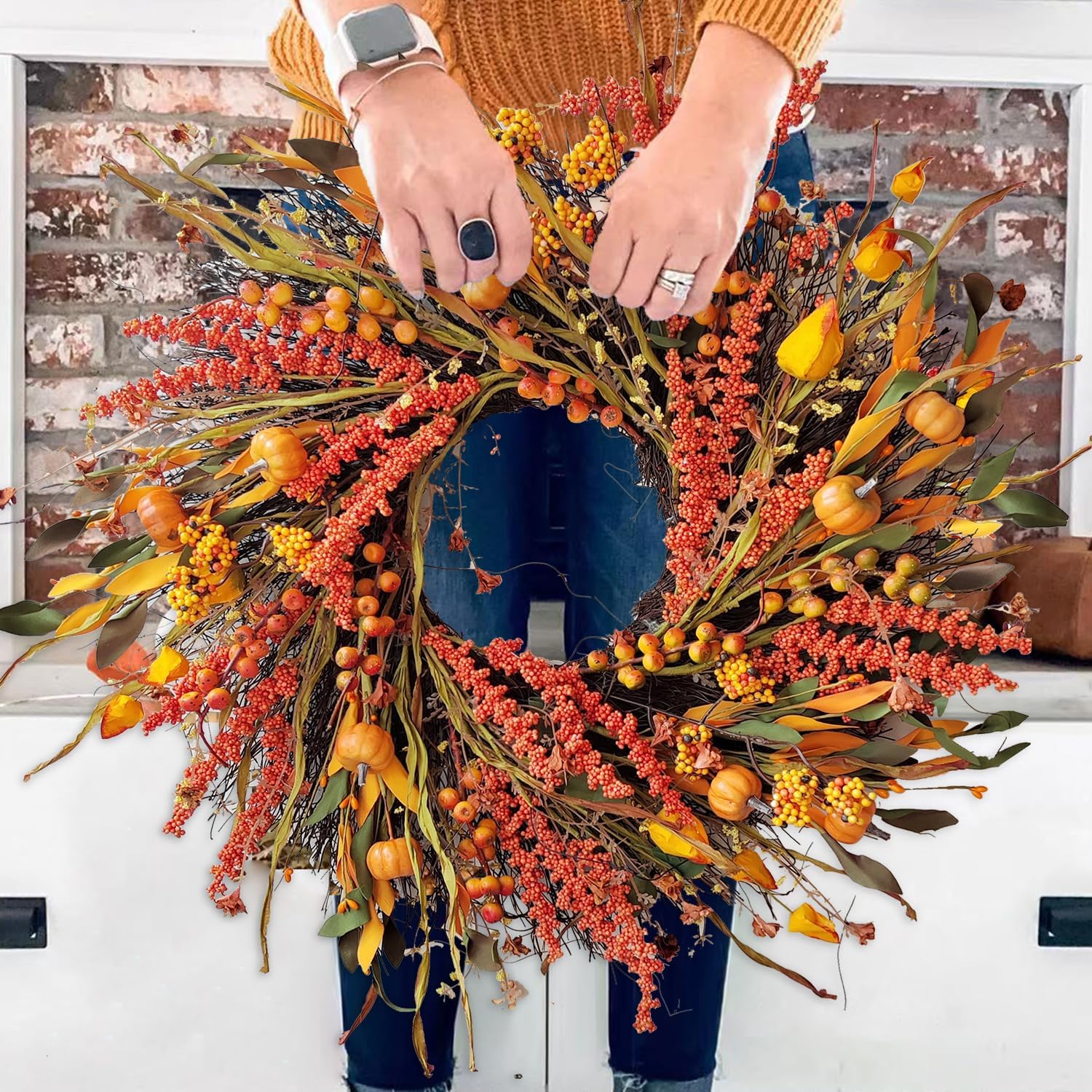 WANNA-CUL 24 inch Fall Wreath Decor for Front Door with Pumpkins, Hawthorn,Grain,Lantern Fruit,Berries,Eucalyptus Leaves, Large Harvest Door Wreath for Autumn or Thanksgiving Decoration