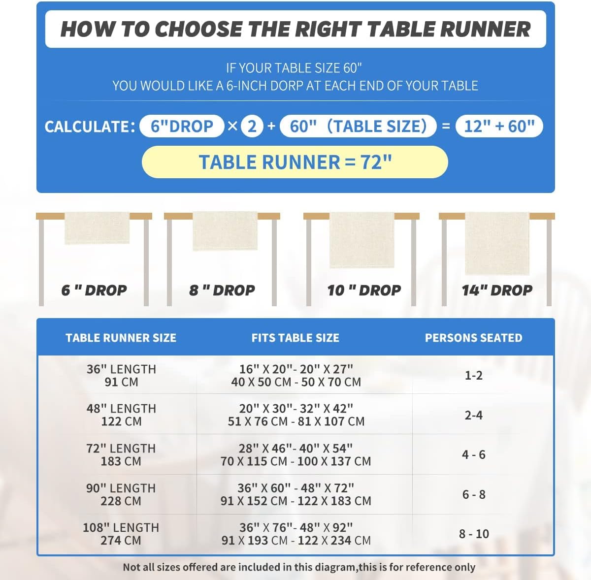 - Fits Table Size : This table runner is 13 x 72 inch, appropriate for a table that can seat 4-6 people, better match your table and give you a delightful dining experience