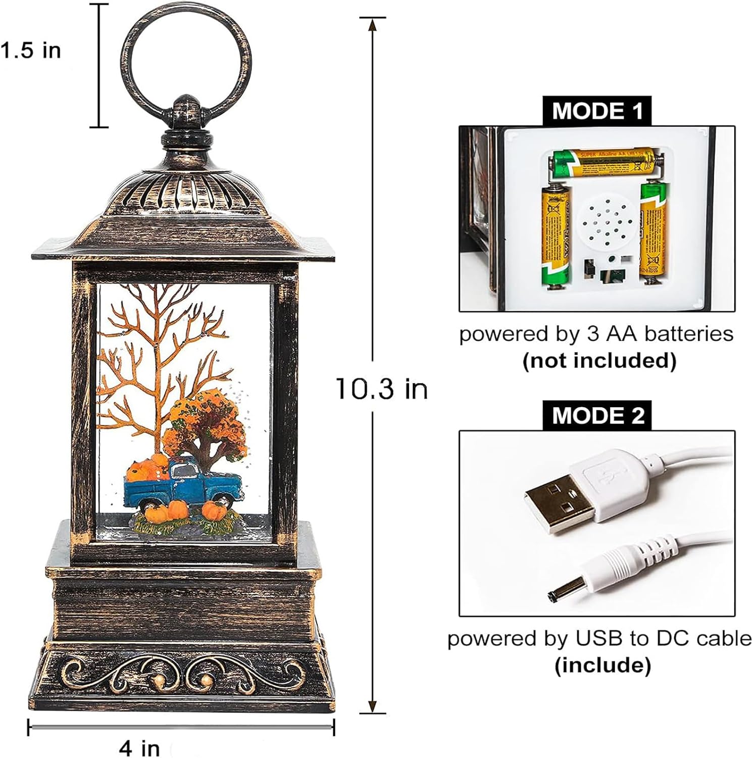 - Inside of the snow globe lantern: Harvest Truch and pumpkin decoration, silver glitter flakes.Swirling glitter around the inside automatically.