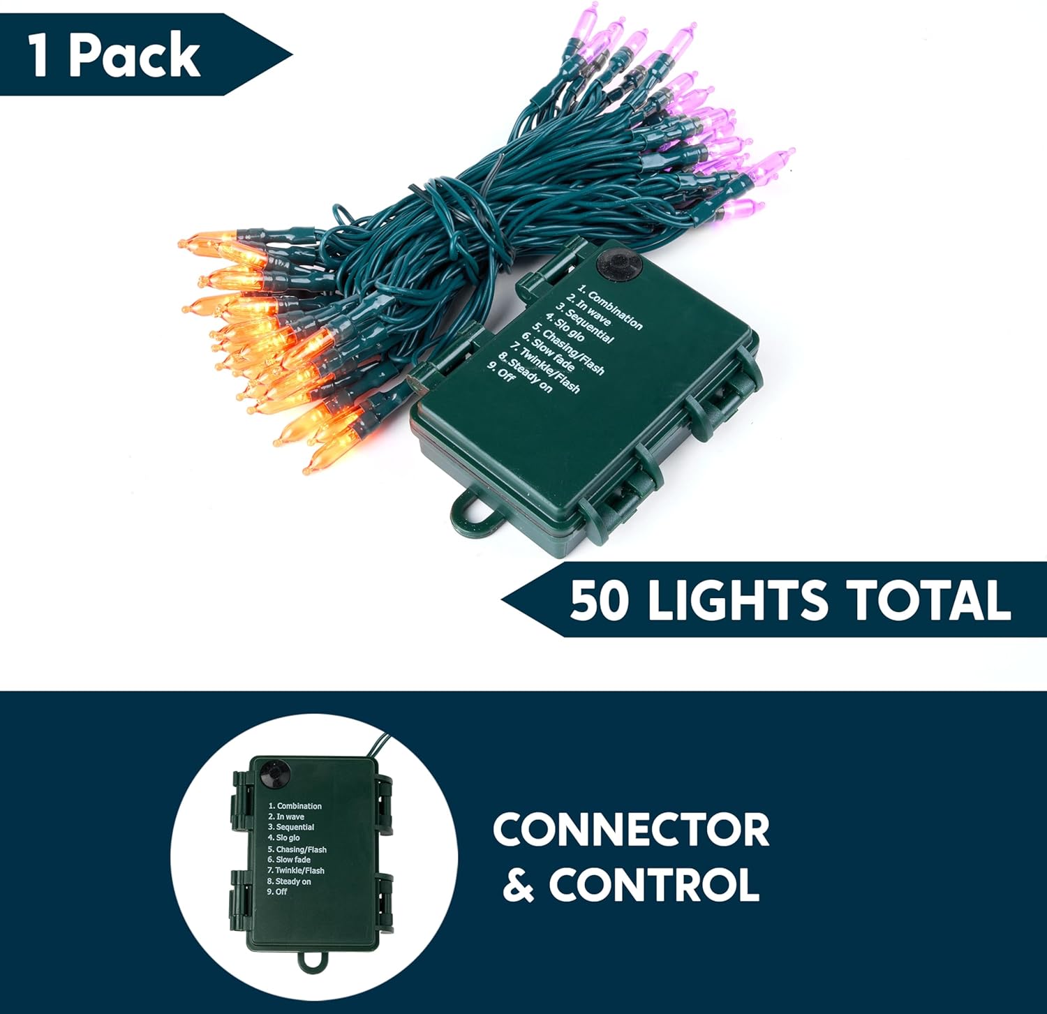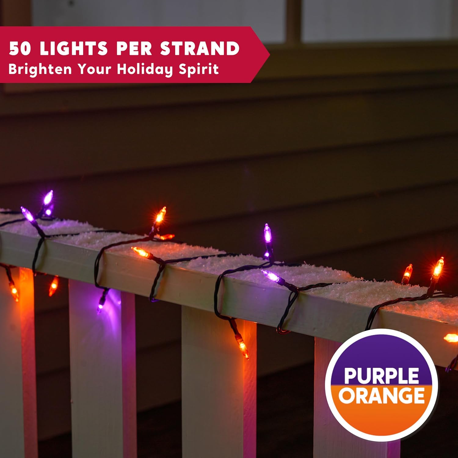 - SUPER VALUE.This orange and purple Halloween lights set includes battery powered string light. Each set has 50 counts of Orange and Purple LED bulbs and measures at 17.3ft. The bulbs interval is at 4 inches and its individual size is 3mm*16mm.