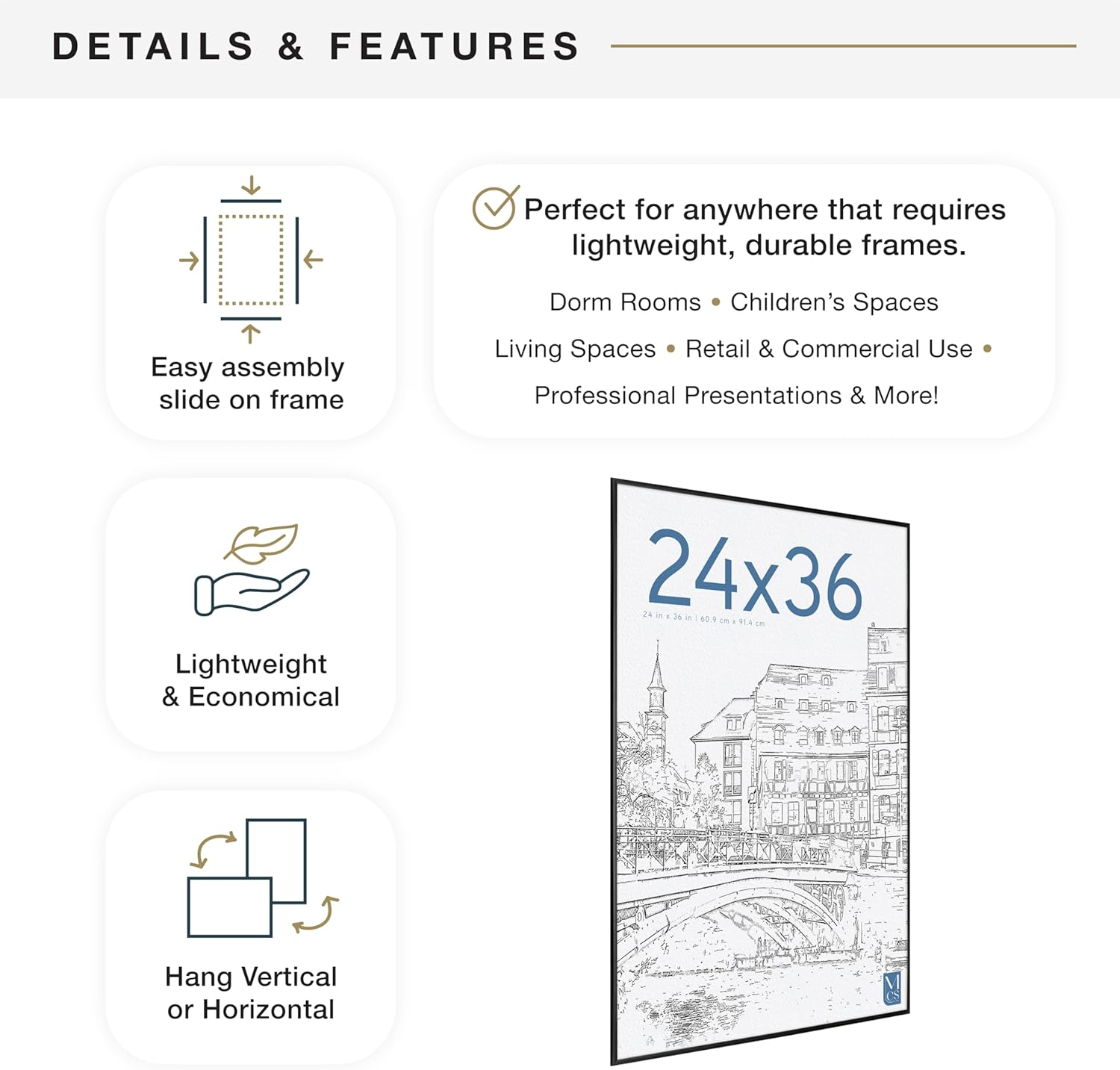 - WALL DECOR: With a passion for design, trend and functionality, MCS delivers best-in-class products that help make your house a home; Use the Original Hanging Poster Frame to create a gallery wall or add a focal point to any room