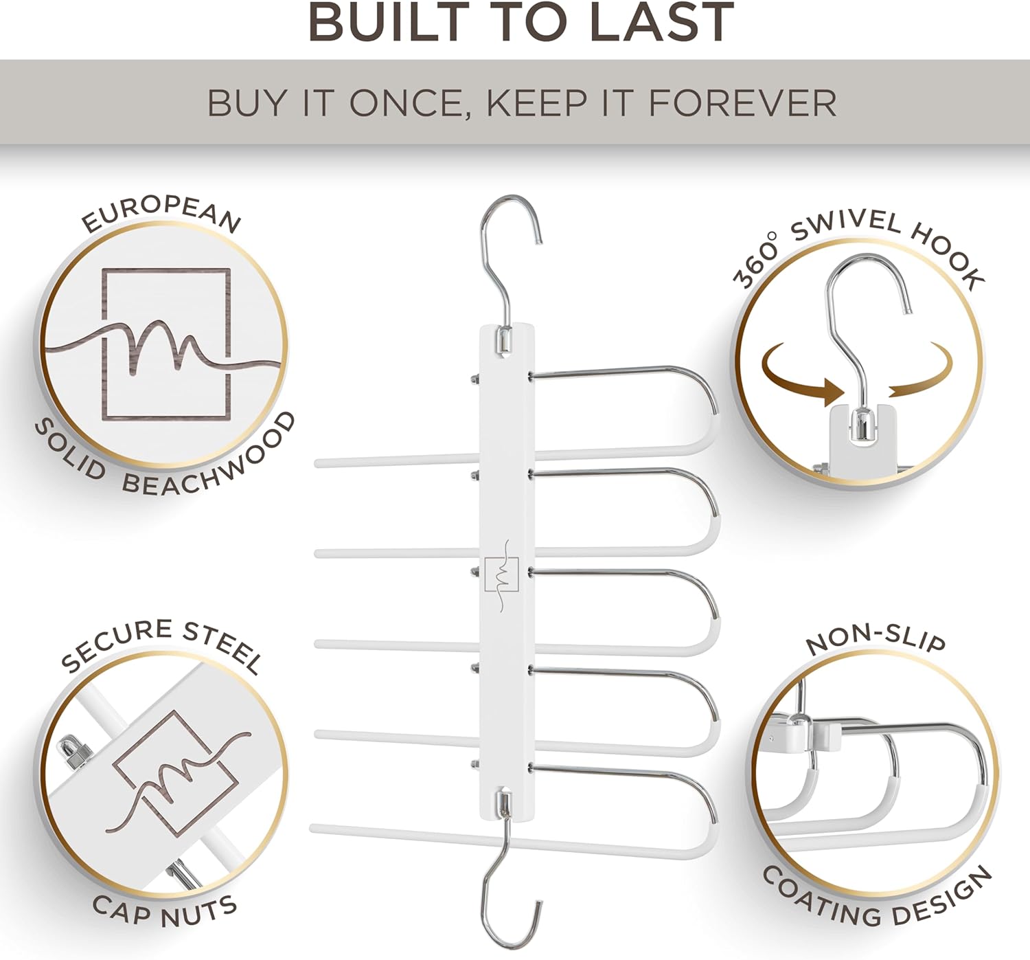 - BUILT STRONG FOR HEAVY CLOTHES - With premium quality beech wood your clothes hanger organizer is built strong to hold up to 30lbs of your heaviest clothes. For light scarf storage or heavy pants our multi functional pants holder will not not bend or break thanks to a quality crafted beech wood hanger organizers.