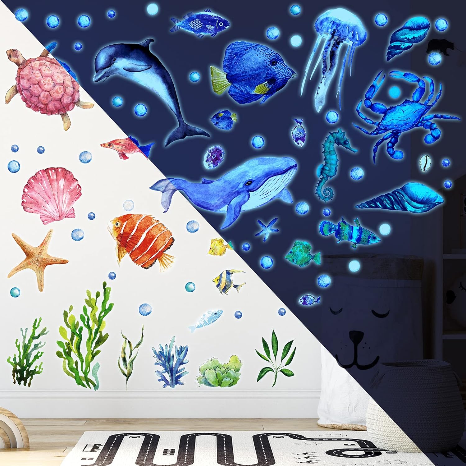 - Glowing style: the fluorescent ocean theme wall stickers will emit blue light; You need to put the fluorescent ocean theme wall stickers under the lamplight, flashlight or sunshine to absorb light for 20 minutes, and then these stickers will keep glowing for 8-15 hours; The longer the stickers take to absorb light, then to light up for up to longer; Normal PVC stickers are also available, give you colorful feelings