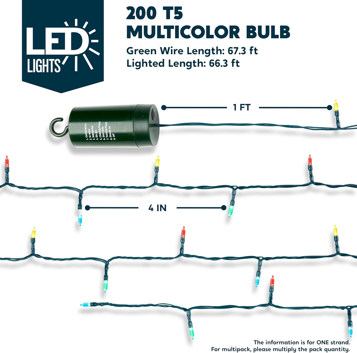 - SUPER VALUE. Our holiday lights set is composed of 200 counts of Multicolor LED in green wire string lights. This is also battery powered string lights (battery not included) with measurements of 67.3ft. It has 67.3 feet wire length and 66.3 ft lighted length.with 4 inch light spacing. The spacing for each bulb is 4 inches with each bulbs size of 3mm*16mm.