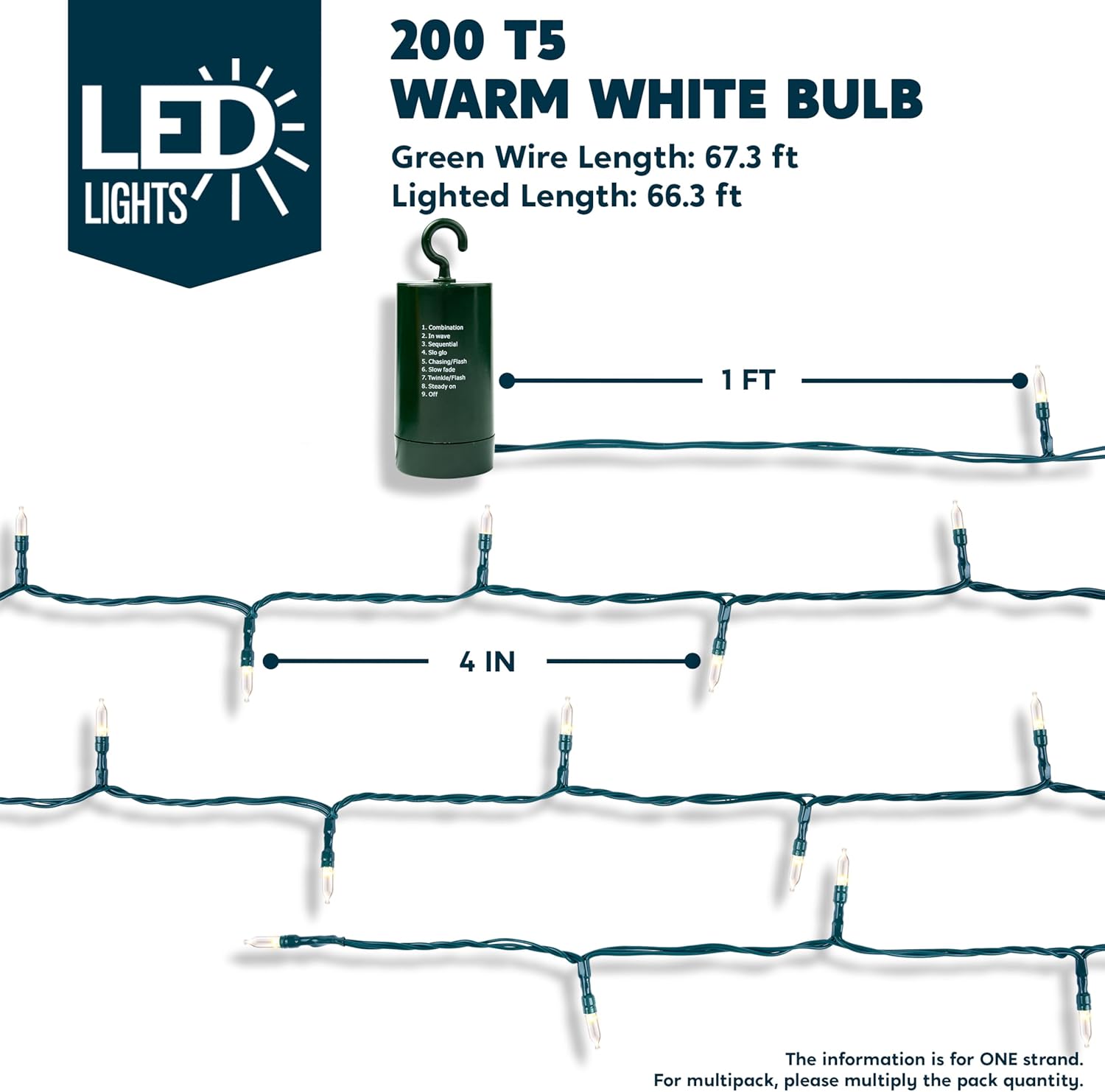 - SUPER VALUE. Our holiday lights set is composed of 200 counts of Clear White LED in green wire string lights. This is also battery powered string lights (battery not included) with measurements of 67.3ft. Each set has 67.3 feet wire length and 66.3 ft lighted length. The spacing for each bulb is 4 inches with each bulbs size of 3mm*16mm.