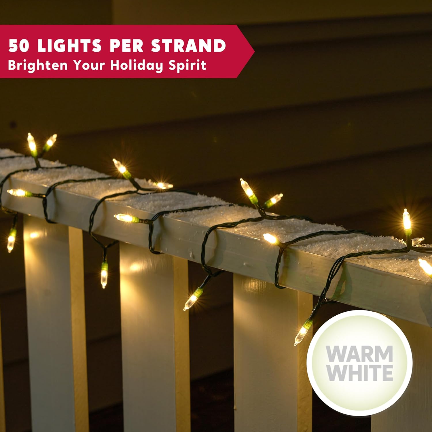 - Ultra-Long 16.7ft Battery Lights with 50 LEDs. Experience magnificent coverage with 50 warm white LED Christmas lights on a 16.7-foot wire, offering ample length to beautifully decorate indoor and outdoor spaces like Christmas trees, gardens, patios, mantels, and windows. The perfect battery-powered string lights for creating a magical holiday atmosphere without needing an outlet.