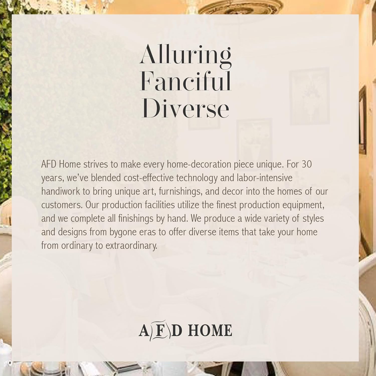 - UNIQUE ART, FURNISHINGS & DECOR: For 30 years, AFD Home has blended technology and craftsmanship to bring elegant pieces into your home. From antique-inspired room accents to reproductions of standout art pieces, we’ll always have just the thing that makes your space feel unique.