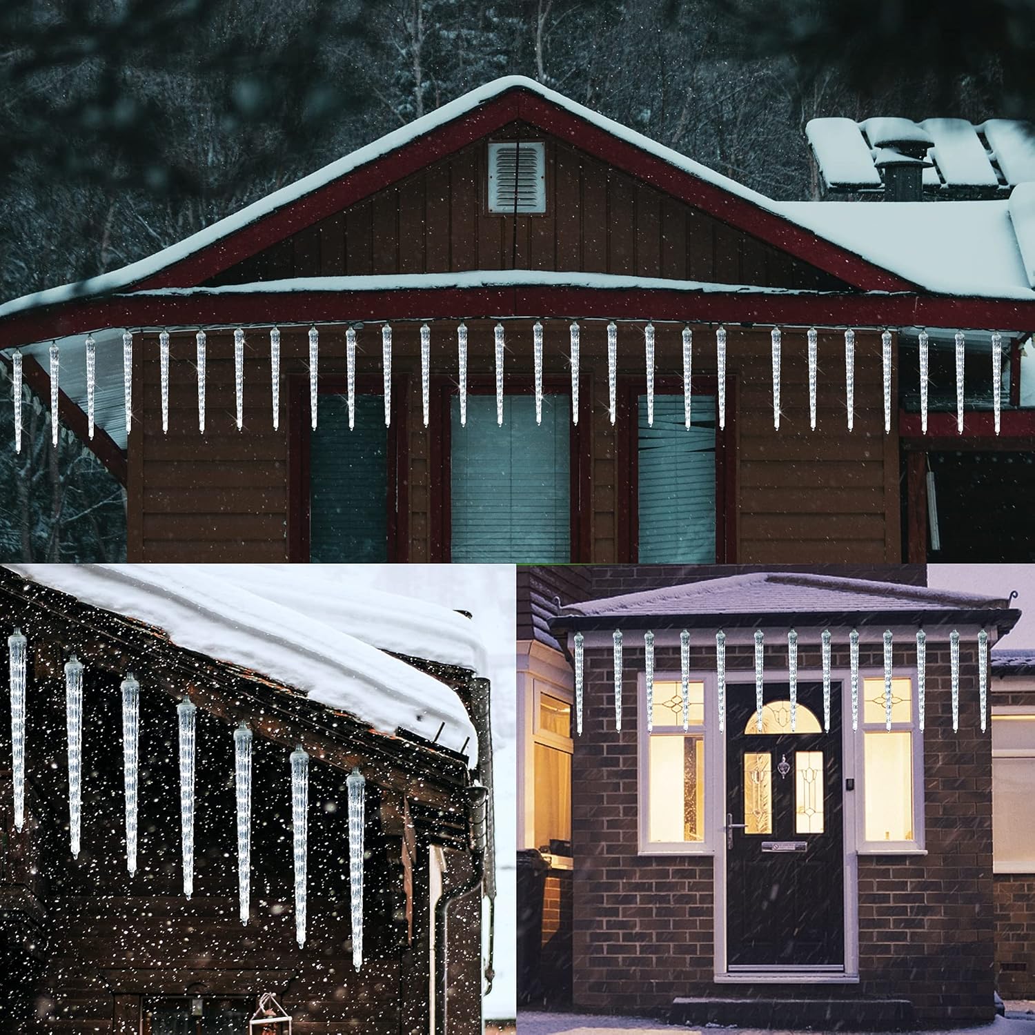 - Icicle Meteor Shower Lights: 8 icicles 192 SMD LED cool white crystal ice falling lights are sure to bring brightness to your home outdoor Christmas decoration. Translucent crystal ice downpipe small columns lights, rows hung in the eaves, getting ready for Christmas day and winter.