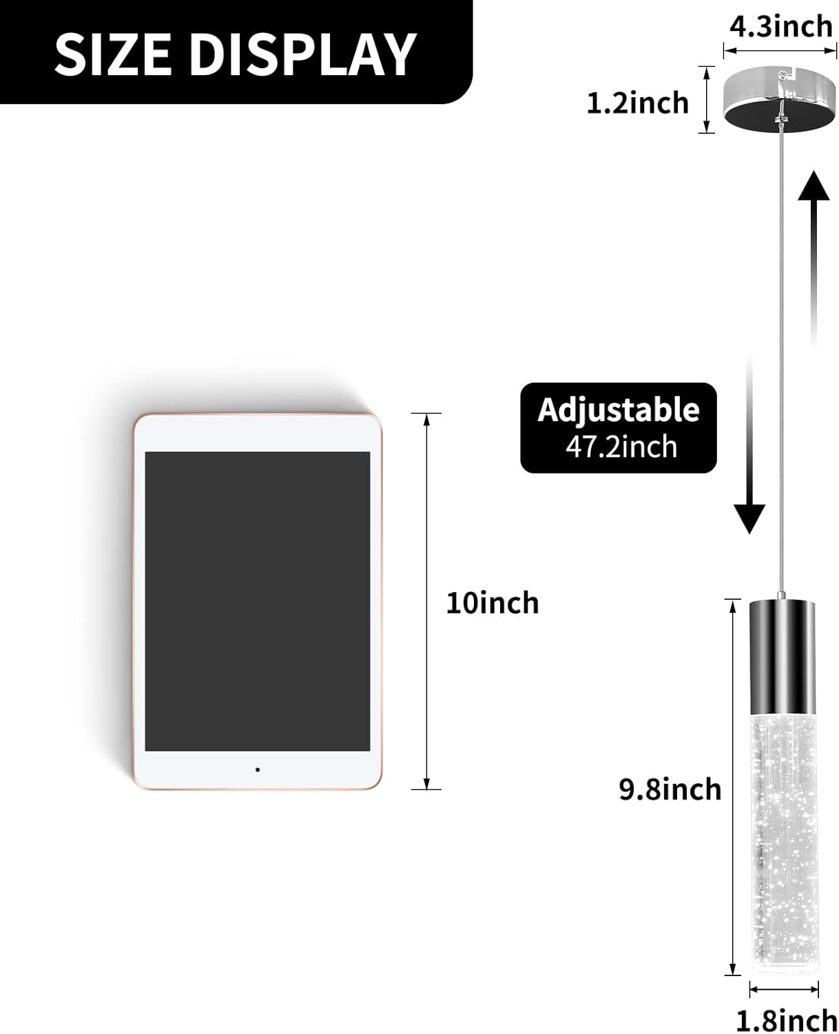 - 【Size and Dimmable】: The cylindrical body of the kitchen island pendant light has a diameter of 1.8 inches and a height of 9.8 inches. The height can be adjusted from 9.8 inches to 47.3 inches. This pendant light is equipped with an ETL-certified dimming driver, and the brightness can be adjusted between 10% and 100%, but it requires a suitable dimmer.