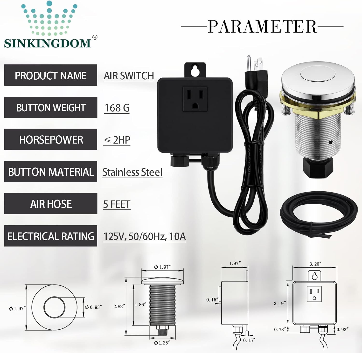 - Digital: 3.20"x 3.19"x 1.97"Power Adapter, 60.00"/1.5M Air Tube and 40.00" Power Cable, 2.95"x 1.25" Air Switch Adapter Button, 1-3/8"Countertop Hole, 2HP, UL Certification.