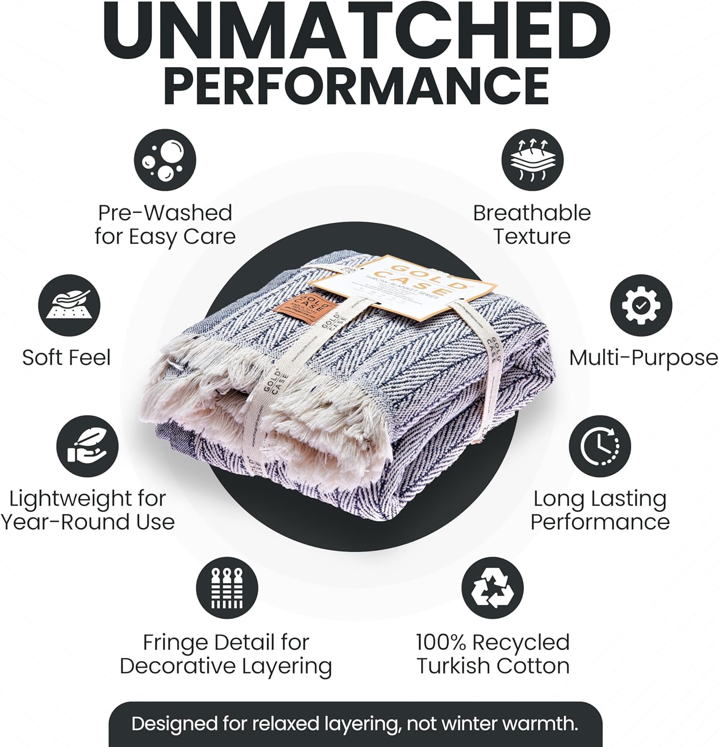 Gold Case Throw Blanket for Couch – 100% Recycled Turkish Cotton Blankets & Throws – Elegant Decorative Throw Blankets for Living Room Sofa – Woven Throws for Couch – Vintage Navy Blue – 50x60