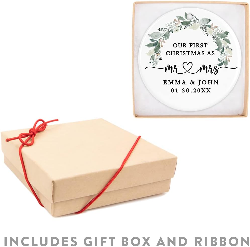 Andaz Press Personalized Our First Christmas As Mr. & Mrs. 2025 Christmas Ornaments Foliage Wreath 2.8" Round Porcelain Ceramic 1st Year Married Custom Ornament Keepsake for Newlyweds 1-Pack
