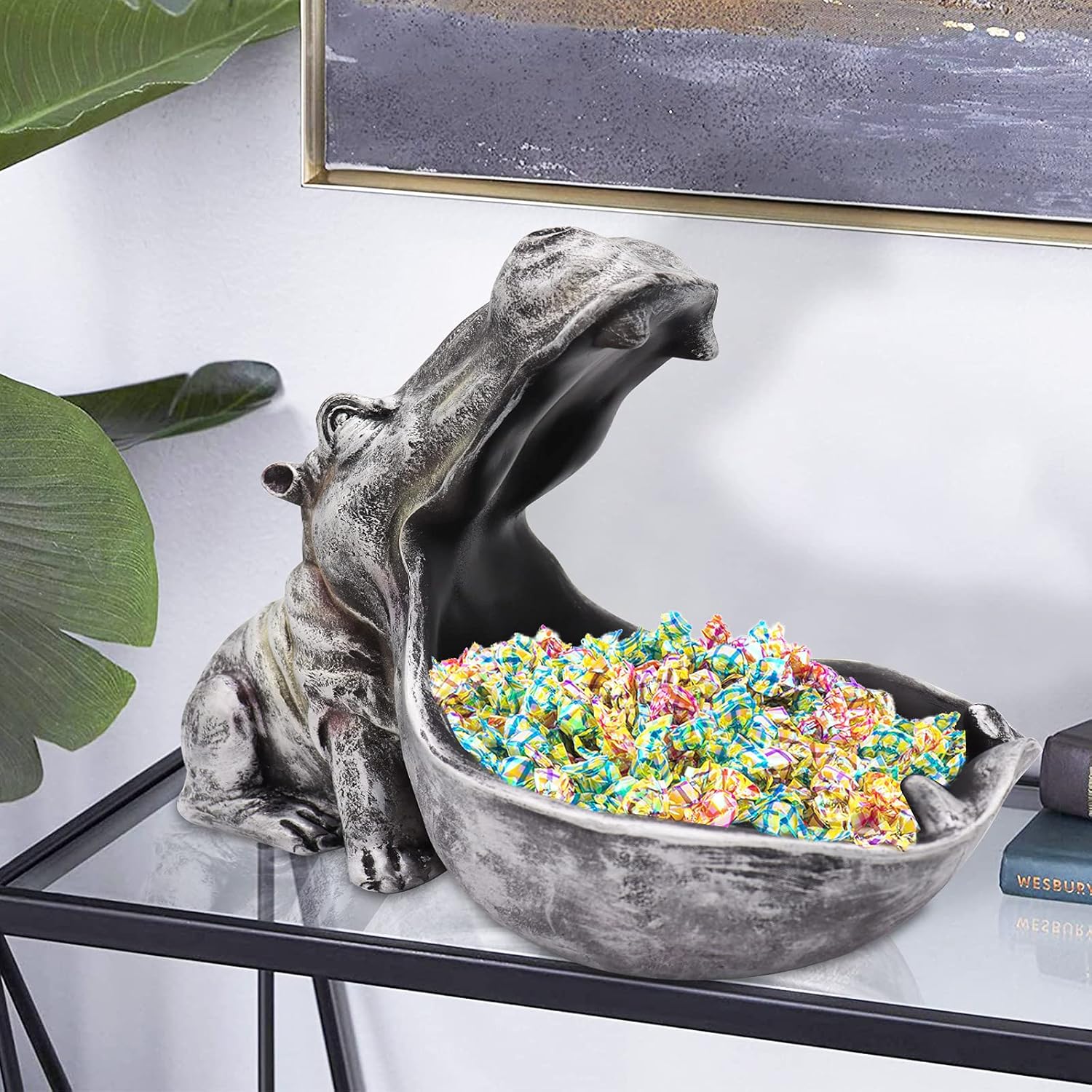 aboxoo Hippo Statue Home Resin Hippopotamus Figurine Fun Candy Dish,Key Bowl,Big Mouth Sculpture Table Art Decoration Sundries Container Storage Boxes (Grey)